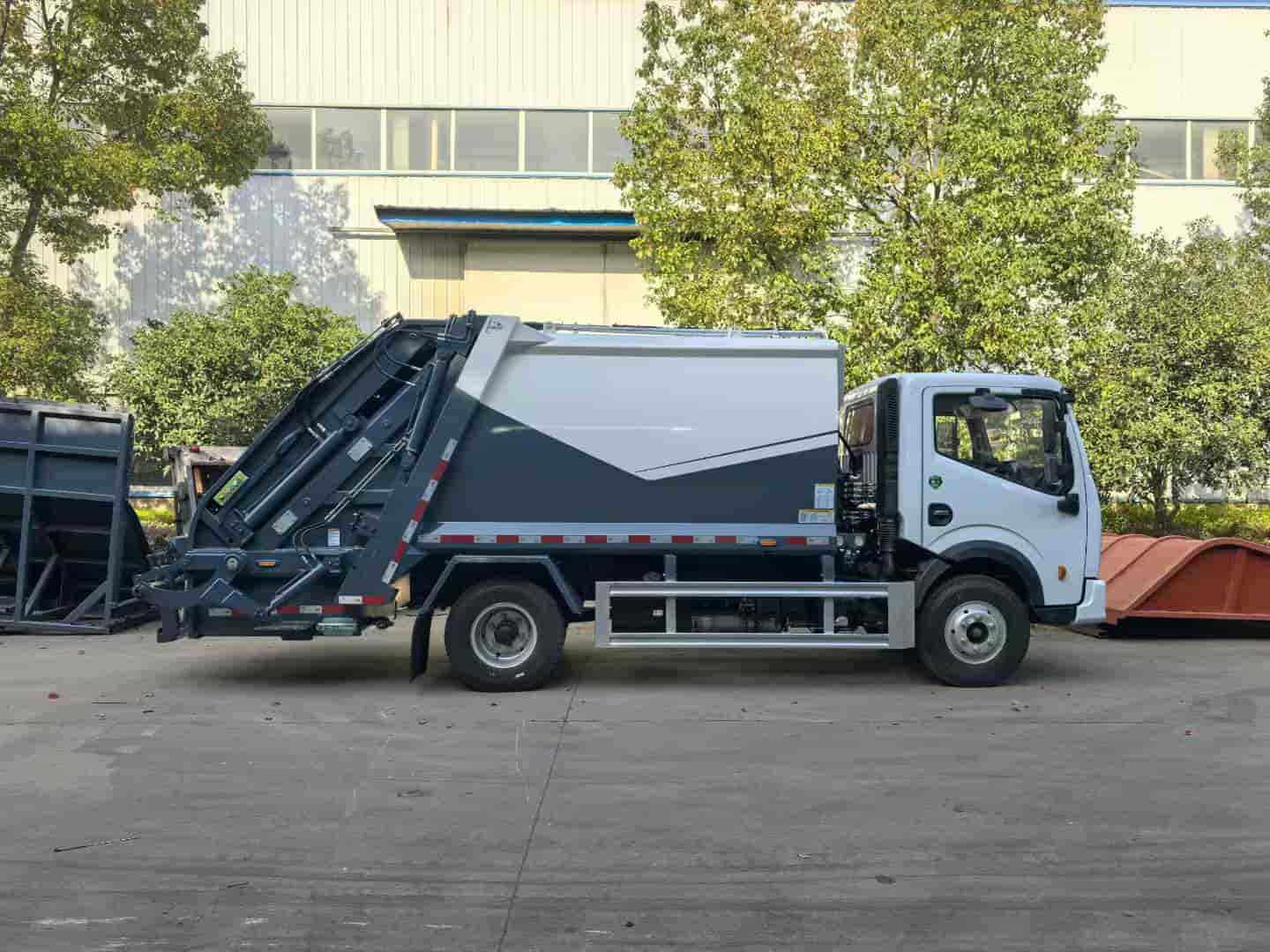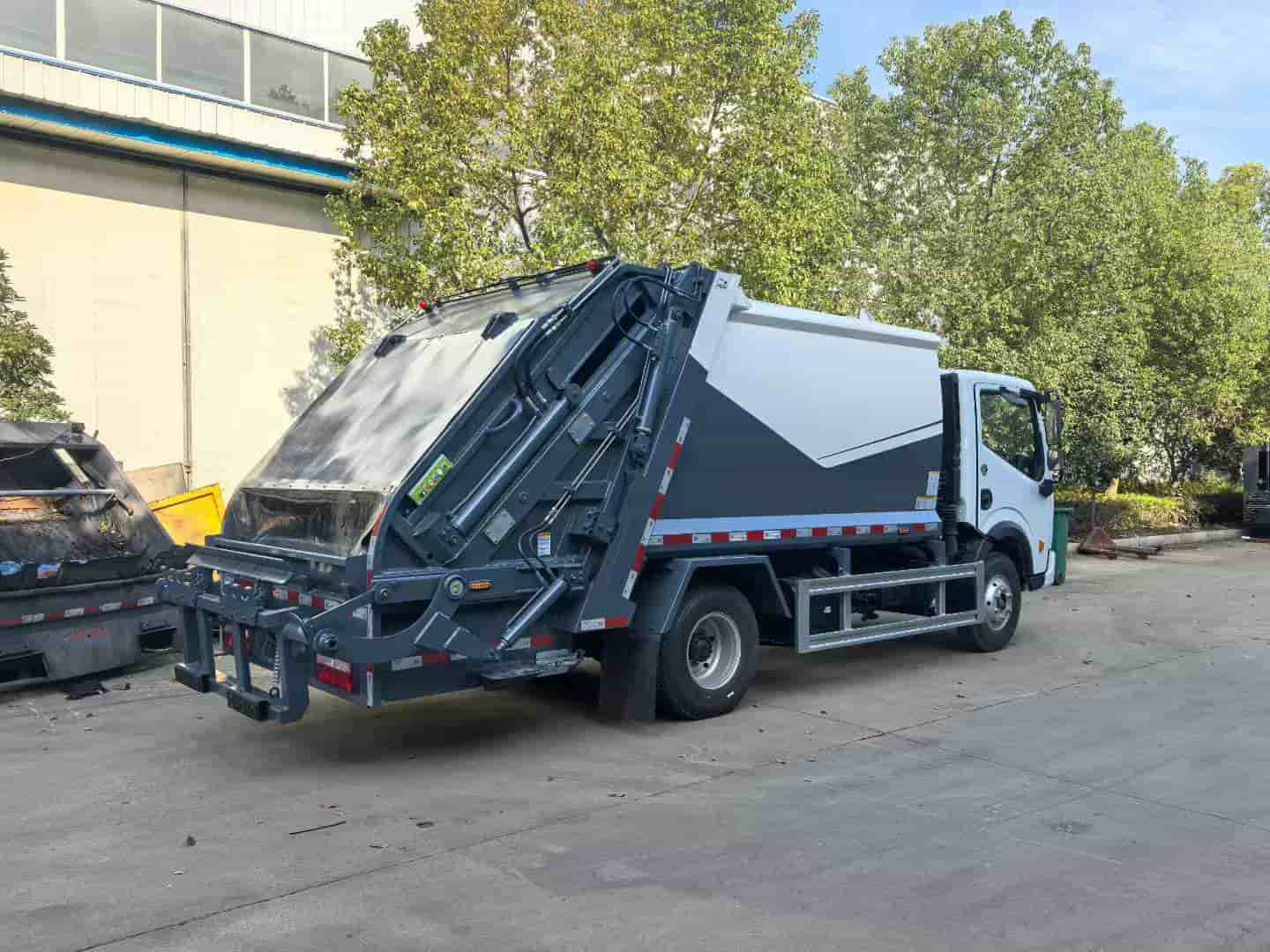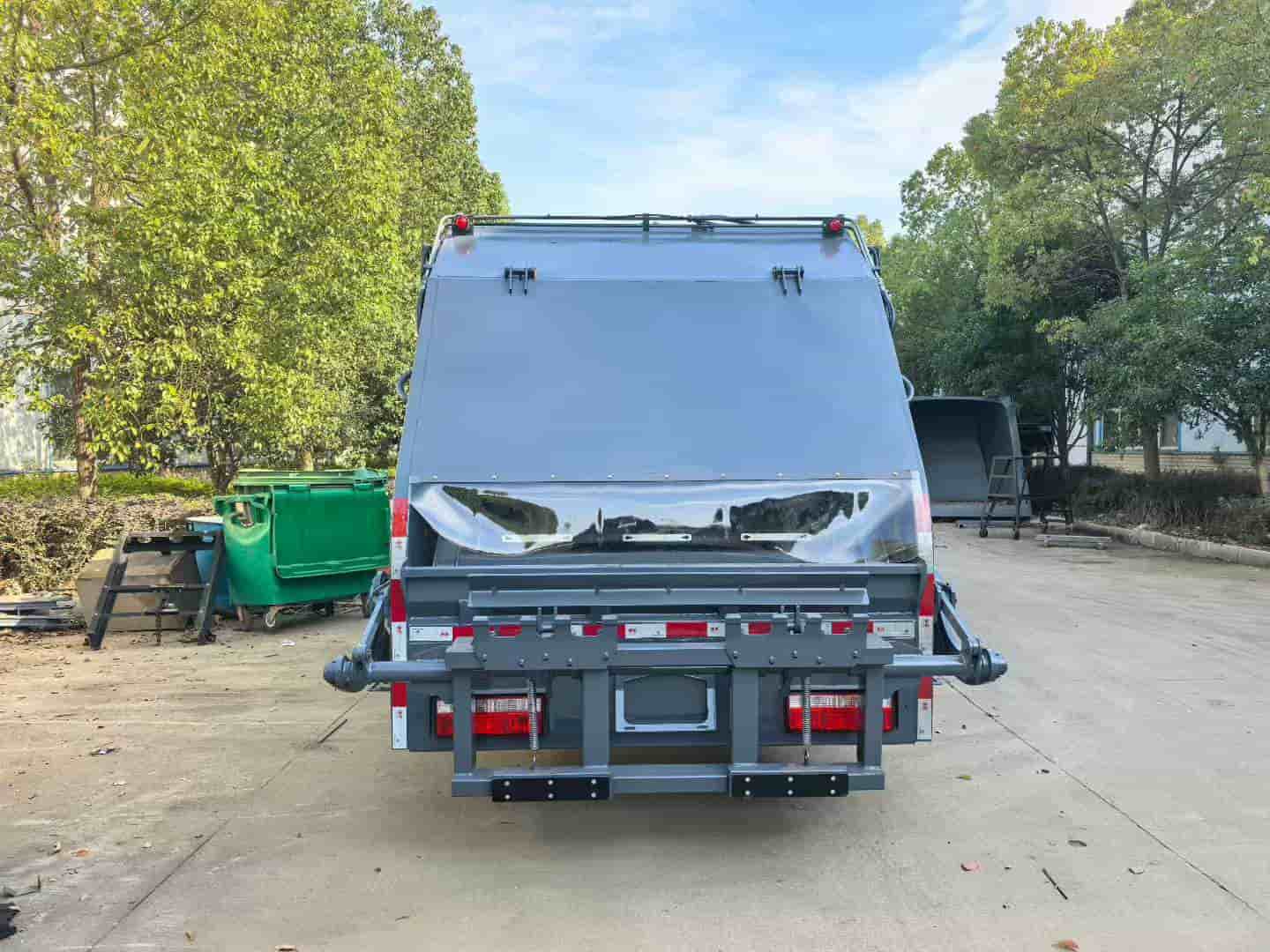 上装配置:弧形箱体,箱体容积8立方,材质边3mm底4mm,福建山友液压油缸,铸铁泵,中梅多路阀,带气动三元件,滑板油缸外置,湖南福力CAN总线电控,带无线遥控器,背压阀,一体式滑块,液压油箱带清理孔,箱体做喷砂处理,环氧富锌防锈底漆,标配翻转架可挂2个240升国标垃圾桶/选装三角斗装置,带侧污水箱,带防尘盖,其余厂家标配。