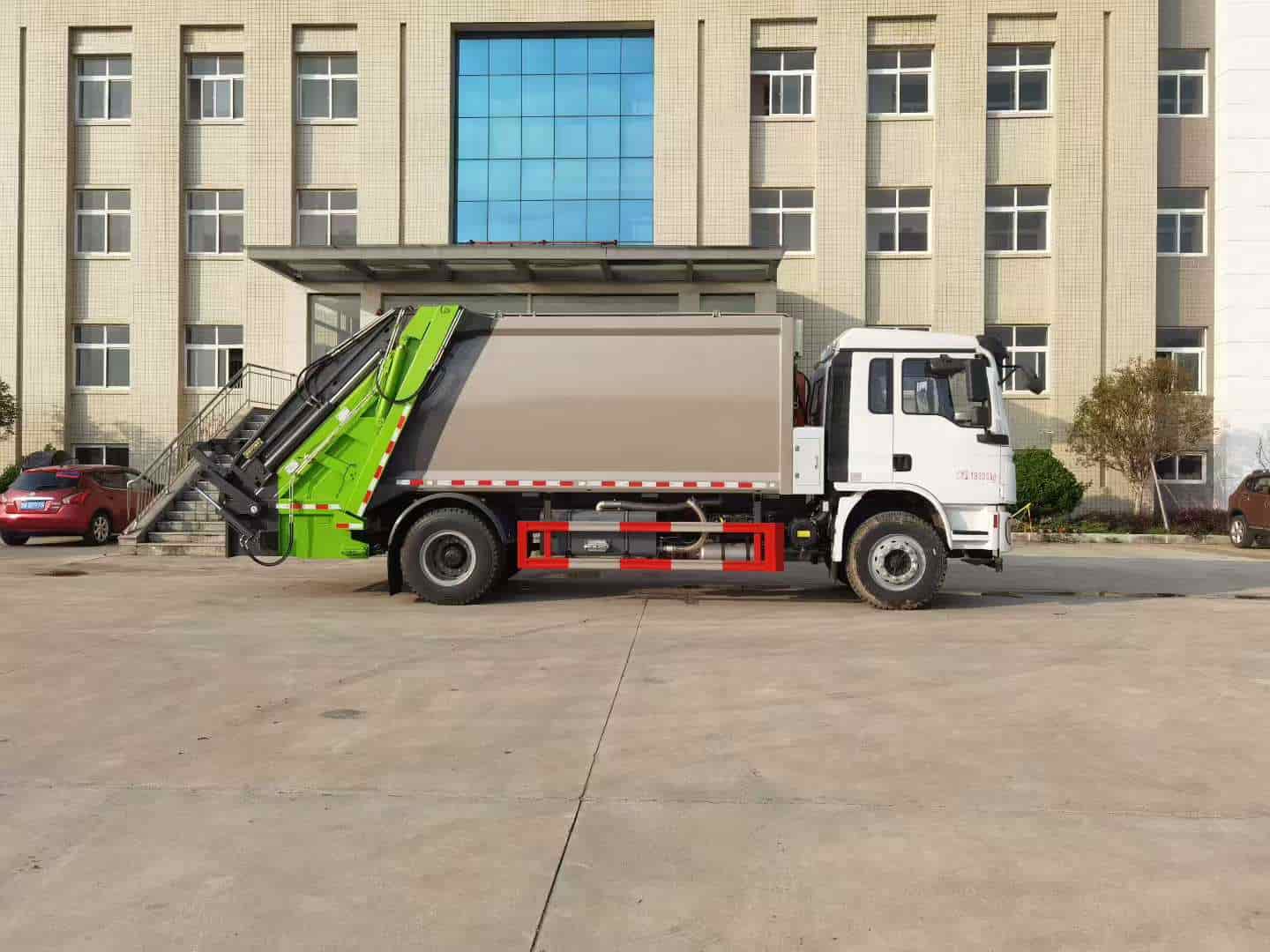 上装配置:弧形箱体,容积16立方,箱体采用Q345锰板,边4mm底5mm,填充器采用Q710高强钢,弧形底板8mm,滑轨8mm,福建山友油缸,强田多路阀,皖液单泵(可选装双联泵),填装器举升油缸带双向平衡阀,采用湖南长沙CAN总线电控系统,德国伊顿操作面板,日本川户无线遥控器(采用光电开关,带一键操作、手动操作和无线遥控三种控制方式),操作盒共两只(驾驶室内部及后尾部右侧可操作,填充器左侧安装一个急停开关),后填装器标准下部一只污水箱,底盘大梁一侧一只污水箱,尾部标配可同时挂两个240升国标垃圾桶,选装防尘盖,选装三角斗,选装全密封斗,其余按公司标准配置制作。