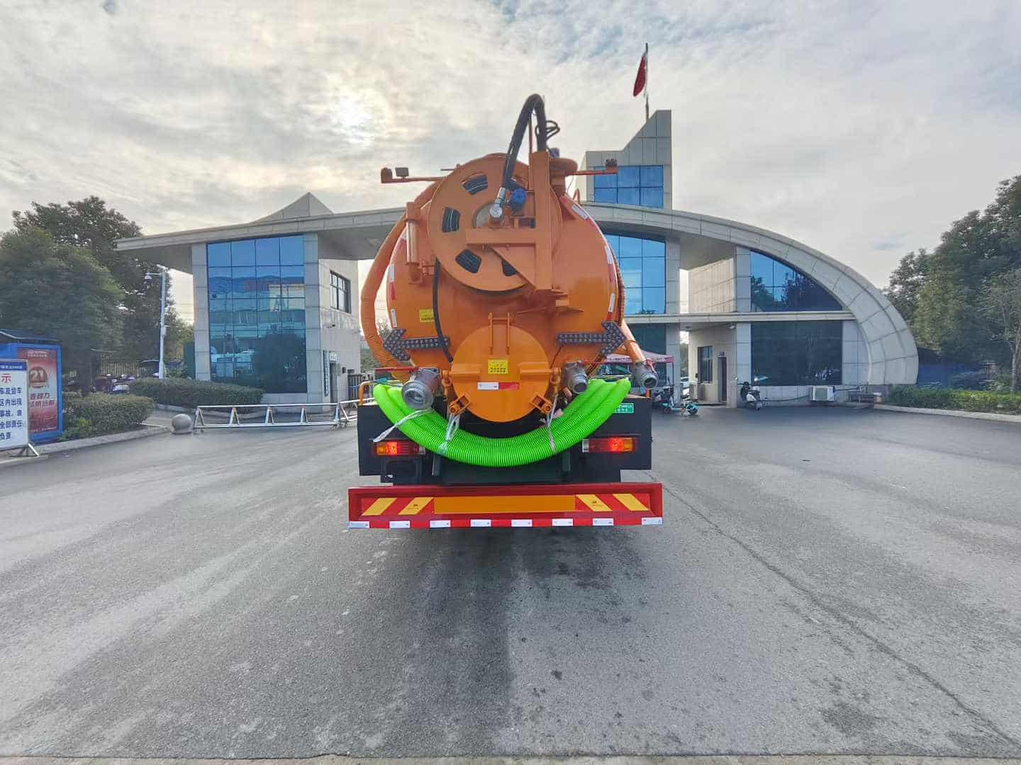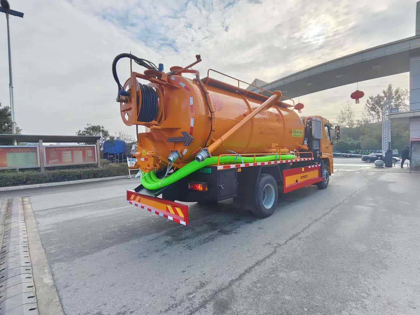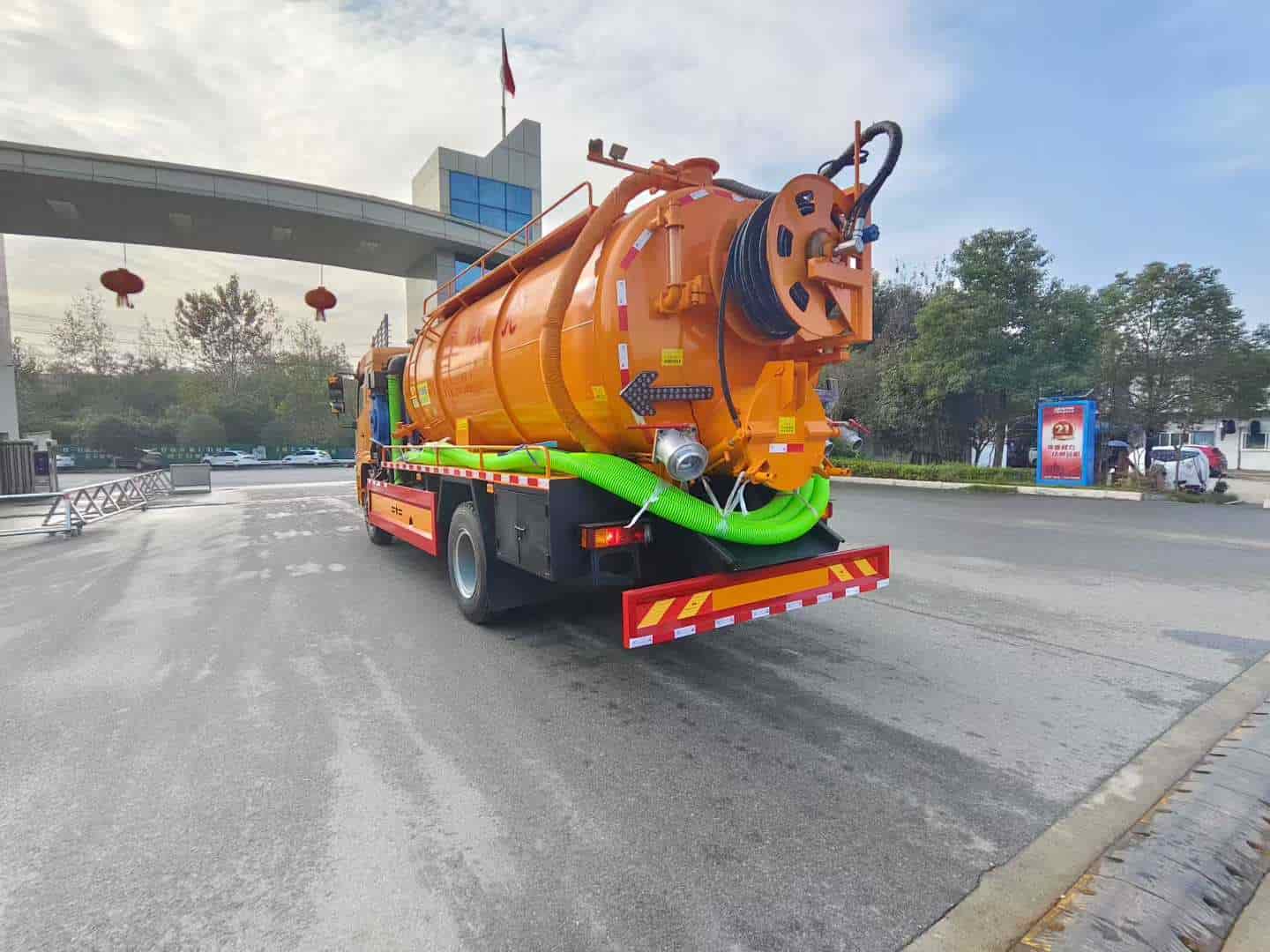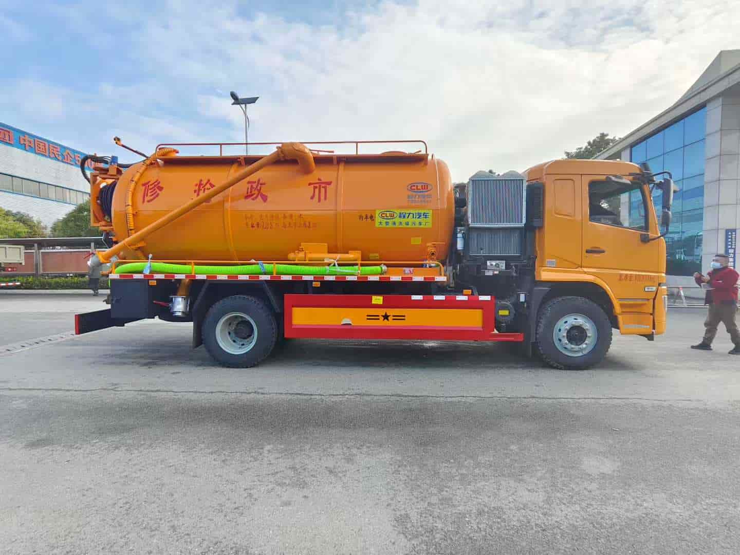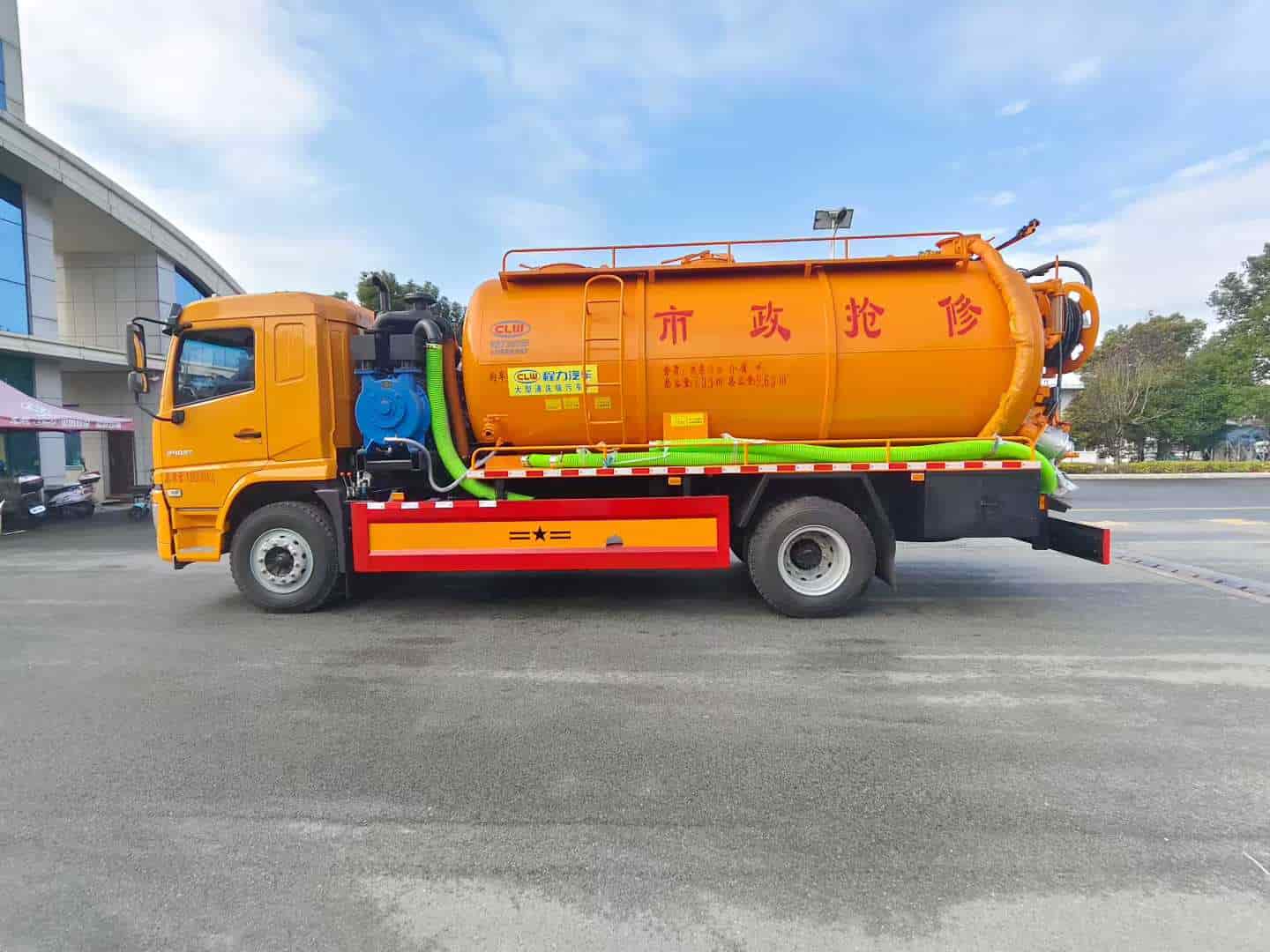 上装配置:罐体容积约15方,8m碳钢板材,清水约5方,其余为吸污,两仓球阀互通。两仓中间用封头,品浮350流量高压清洗泵,配100米高压管。选装安装SK-30水环泵配375马力副发,配8mm厚方管加强底座。卷盘装后封头180度旋转,后封头液压打开。后封头上一个600水泥盖放污,可液压开启,侧面一个6寸偷排阀,后封头一个6寸出口,一个100寸进口直通罐顶,罐内铺不锈钢板,8mm厚方管加强型车架,自卸车设计,罐体尾部箭头灯,带一个视污窗口。带8米吸污管。其余厂内标配!