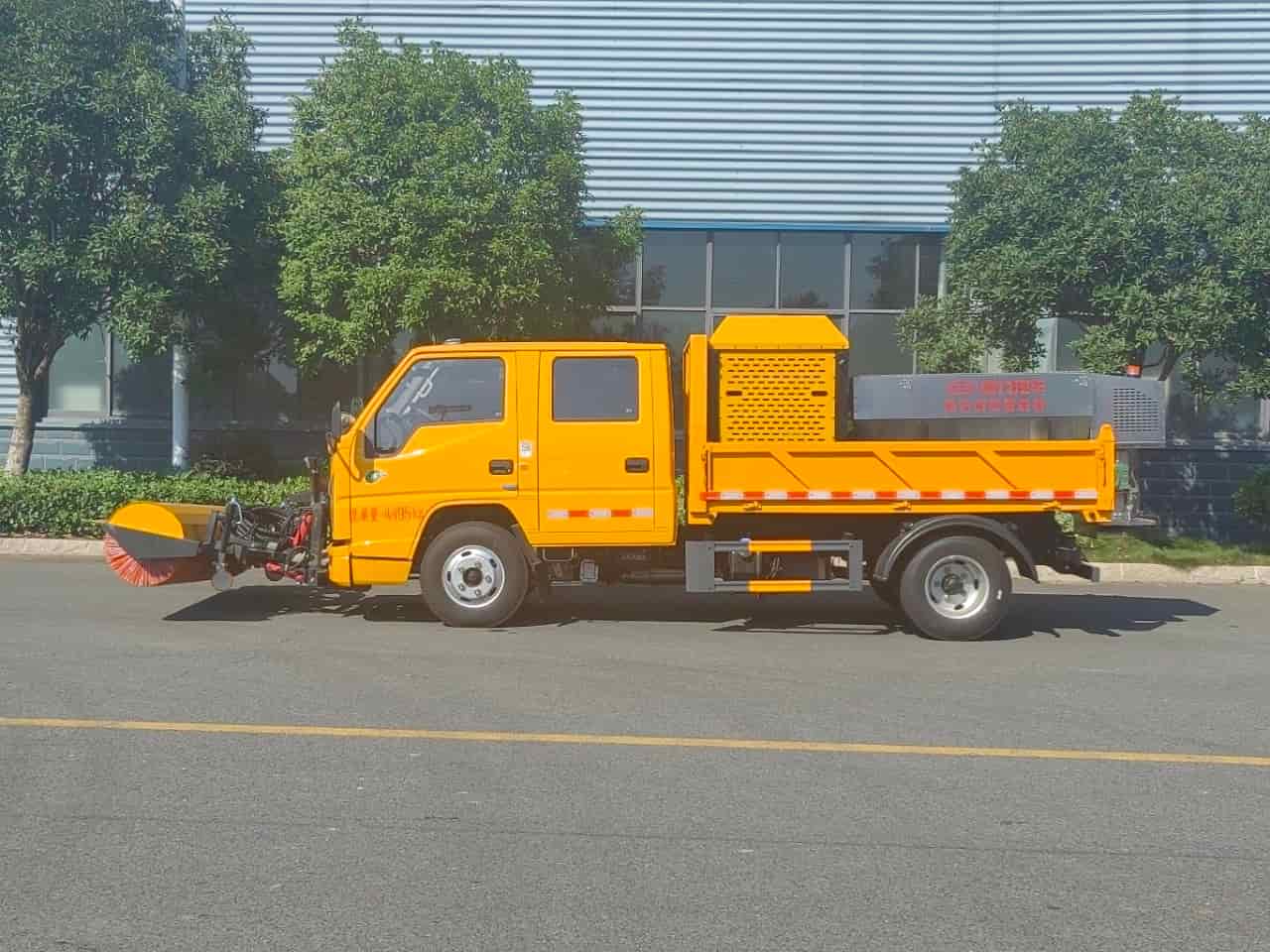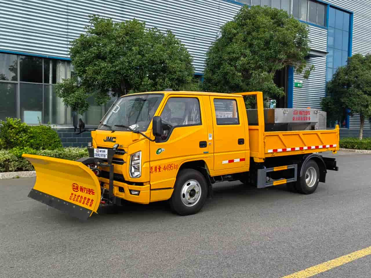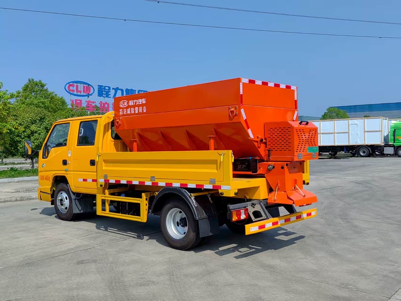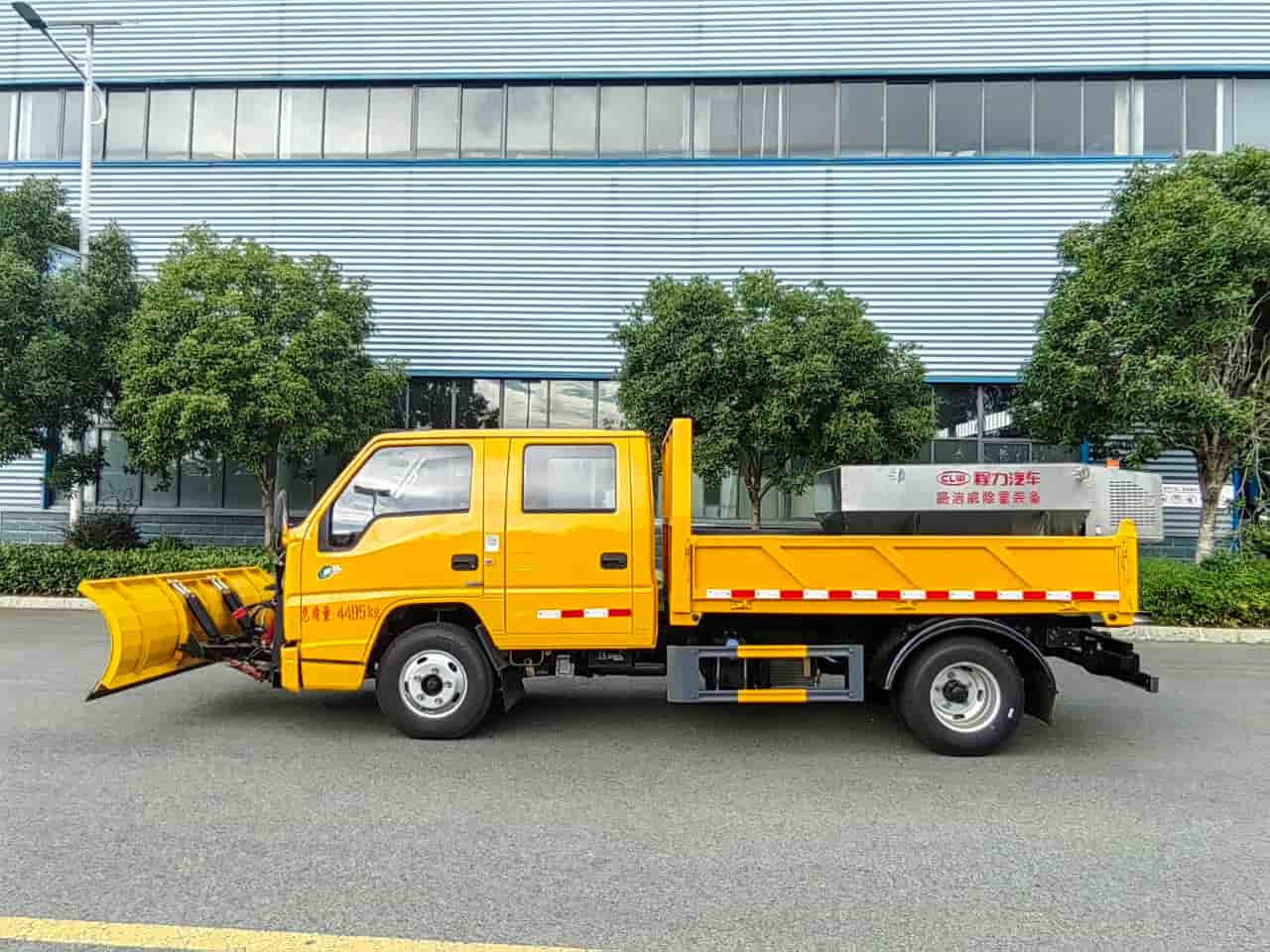 上装配置:普通载货型货箱,配备3立方/4方融雪撒布机,独立柴油动力,刮板链条输送方式,采用V型料仓,顶部带防雨罩,折叠式不锈钢撒布盘,采用集成按键线控式驾驶室操作模式。