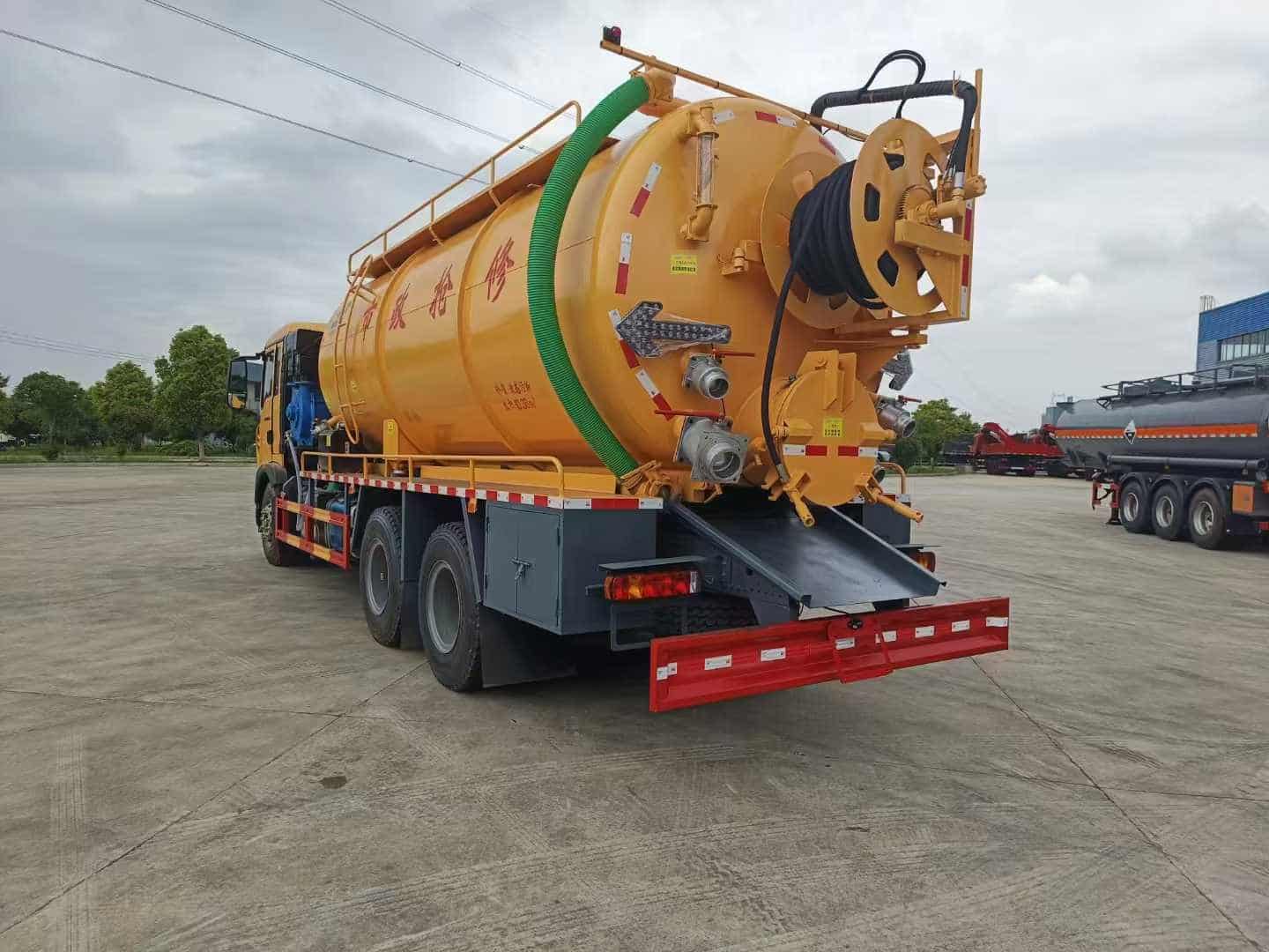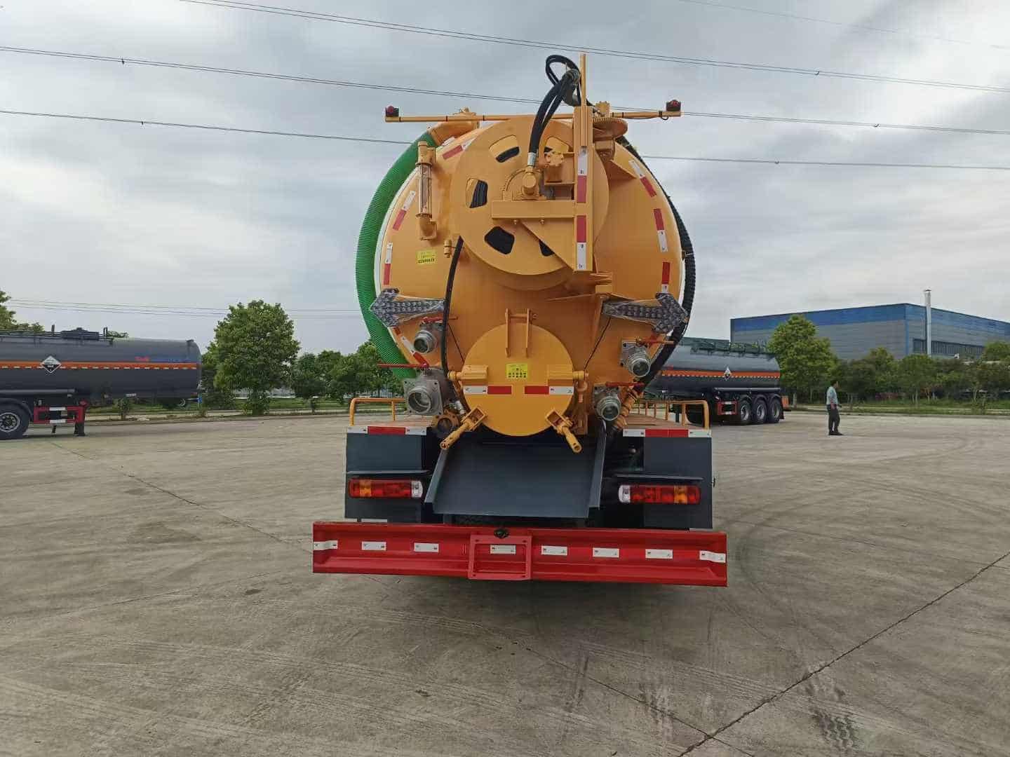 上装配置:罐体容积约23方,8m碳钢板材,清水约5方,其余为吸污,两仓球阀互通。两仓中间用8mm封头,品浮350流量高压清洗泵,配100米高压管。选装安装42/258水环泵配420/460马力副发。卷盘装后封头180度旋转,后封头液压打开。后封头上一个600水泥盖放污,可液压开启,侧面一个6寸偷排阀,后封头一个6寸出口,一个100寸进口直通罐顶,罐内铺不锈钢板,重载自卸车8mm副车架,罐体尾部箭头灯,带一个视污窗口。其余厂内标配。