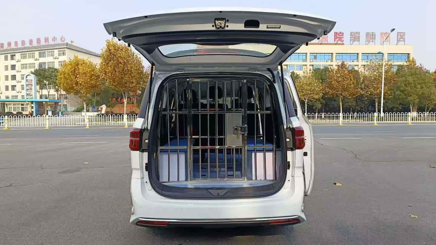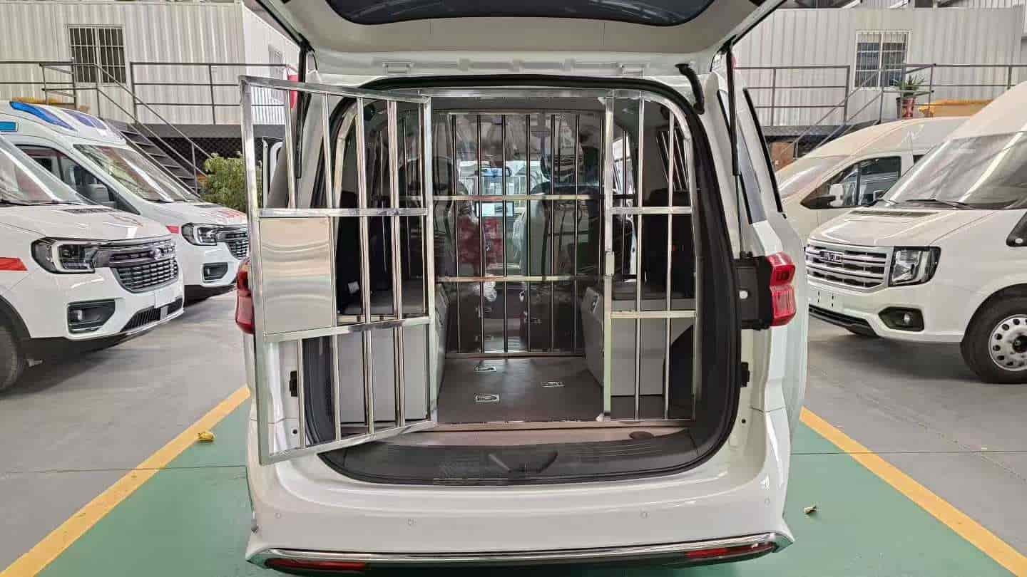 -囚笼设施:有不锈钢独立囚笼,可根据需求改装多种囚笼布设。囚室独立封闭且相互隔离,有盲窗防护,两侧囚犯座椅配备齐全,手铐脚镣固定环。