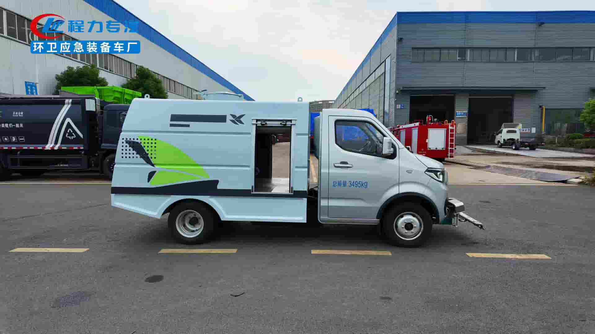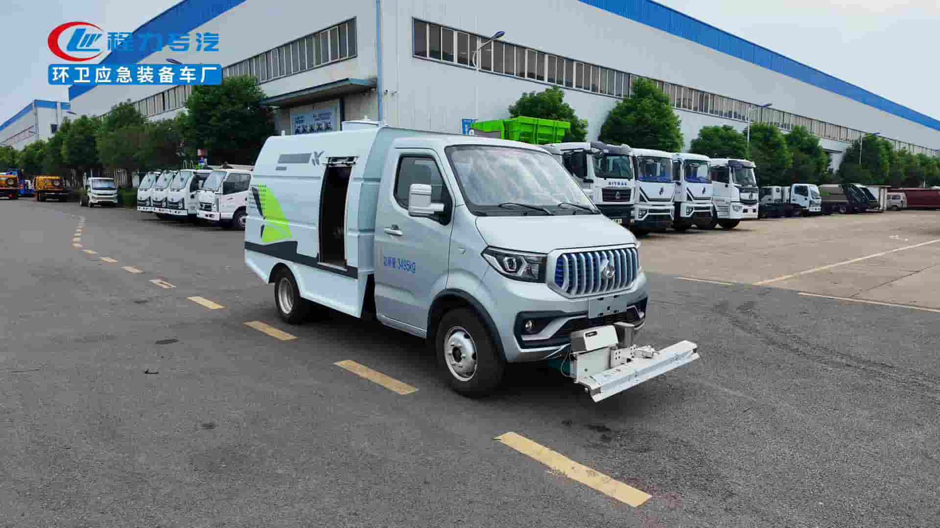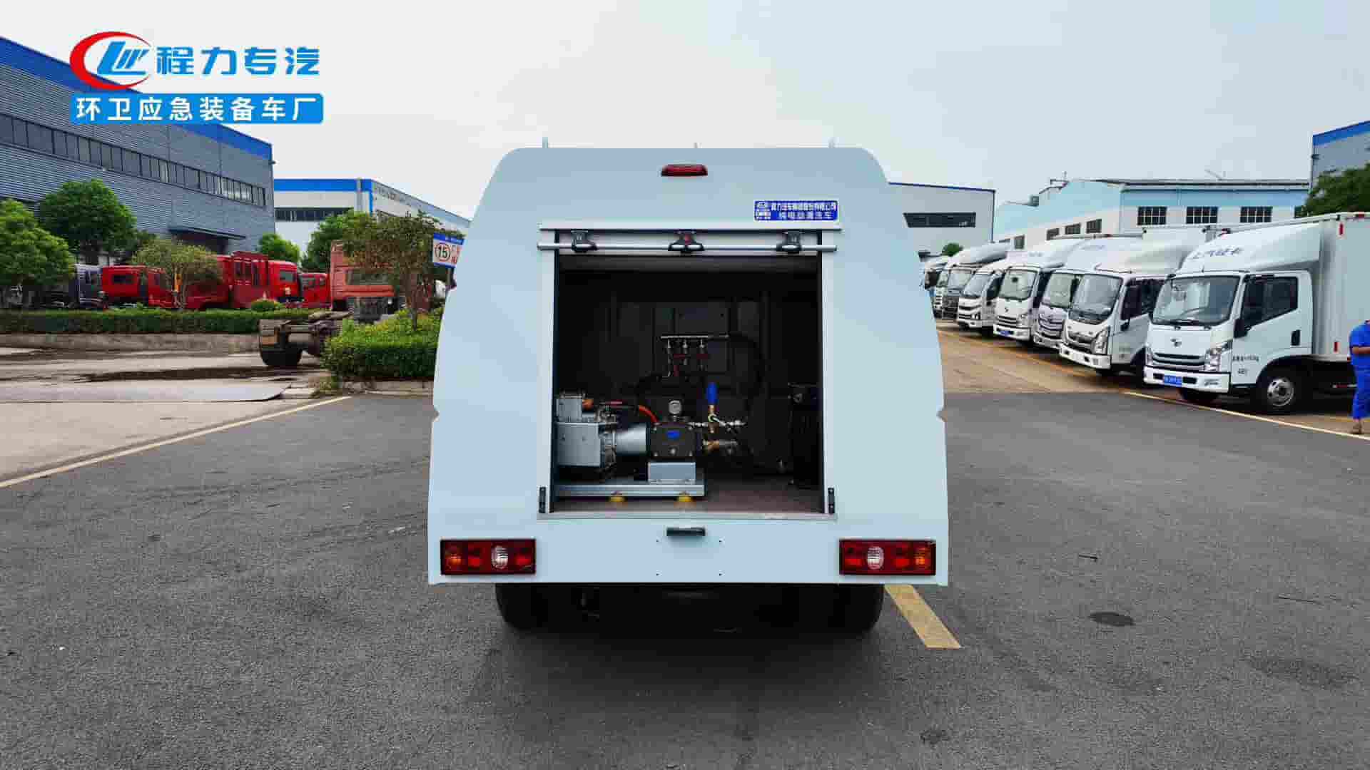 185R14LT轮胎,后置后驱,续航270km,宁德时代磷酸铁锂电池53.58kWh,峰值功率85KW.上装容积1.5立方米,进口高压泵,18米卷盘冲洗水枪,前置冲洗支架清洗宽度1.5米带定点喷射。