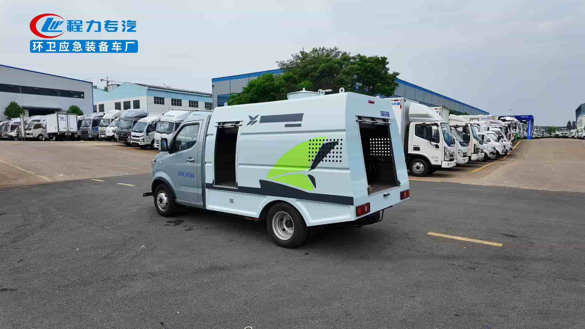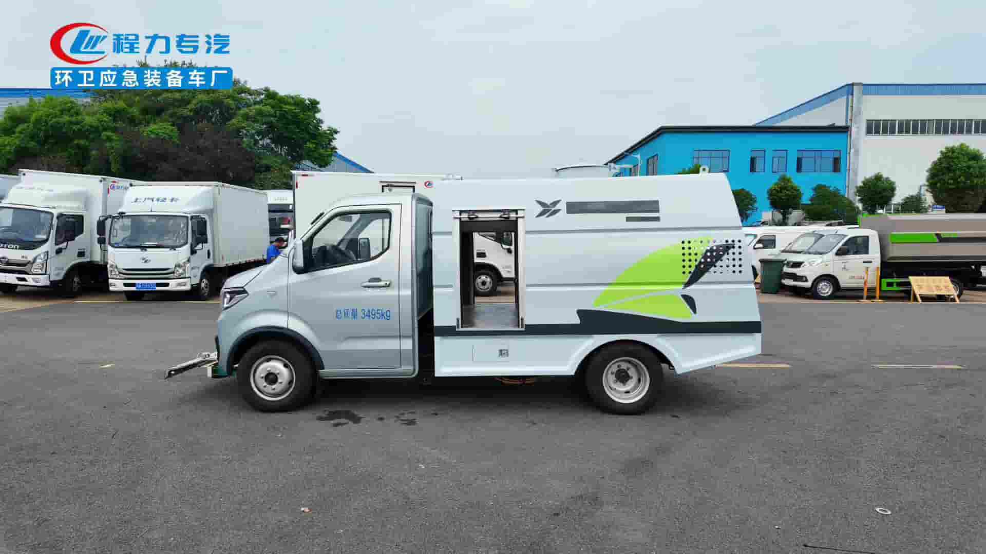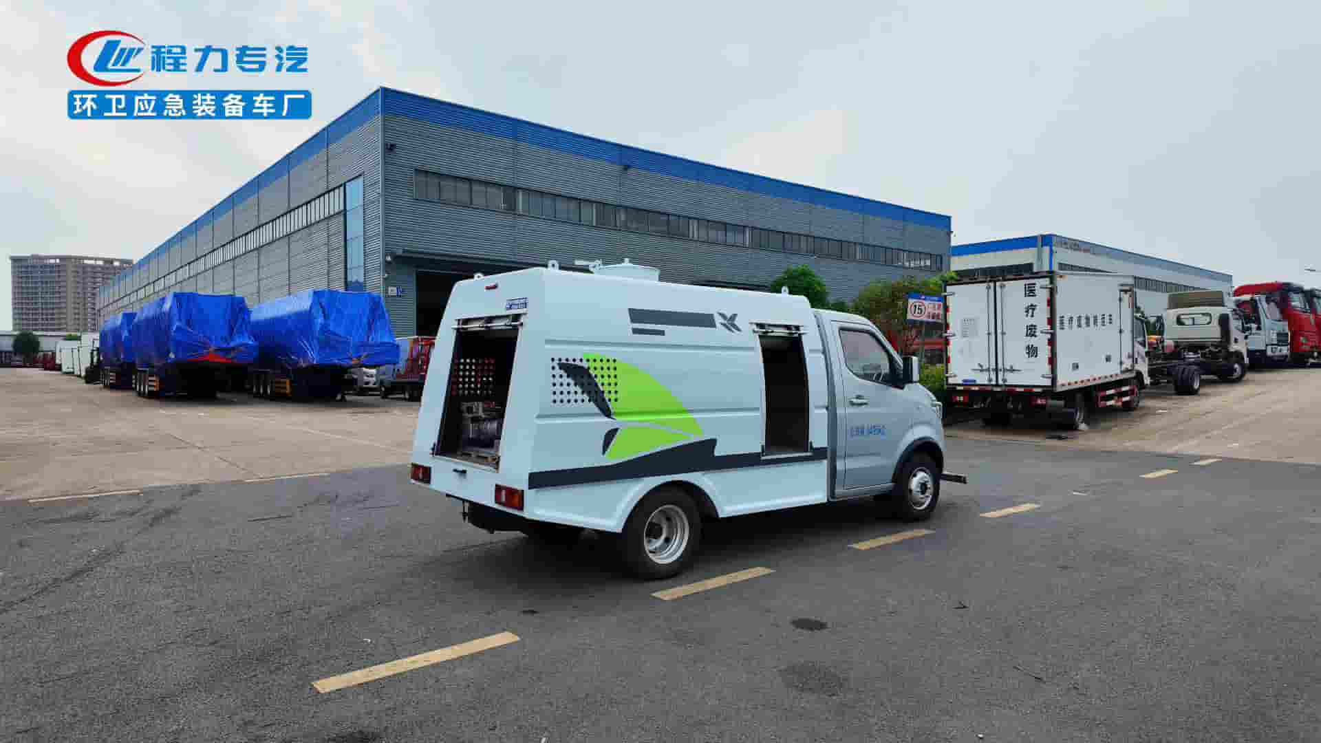 185R14LT轮胎,后置后驱,续航270km,宁德时代磷酸铁锂电池53.58kWh,峰值功率85KW.上装容积1.5立方米,进口高压泵,18米卷盘冲洗水枪,前置冲洗支架清洗宽度1.5米带定点喷射。