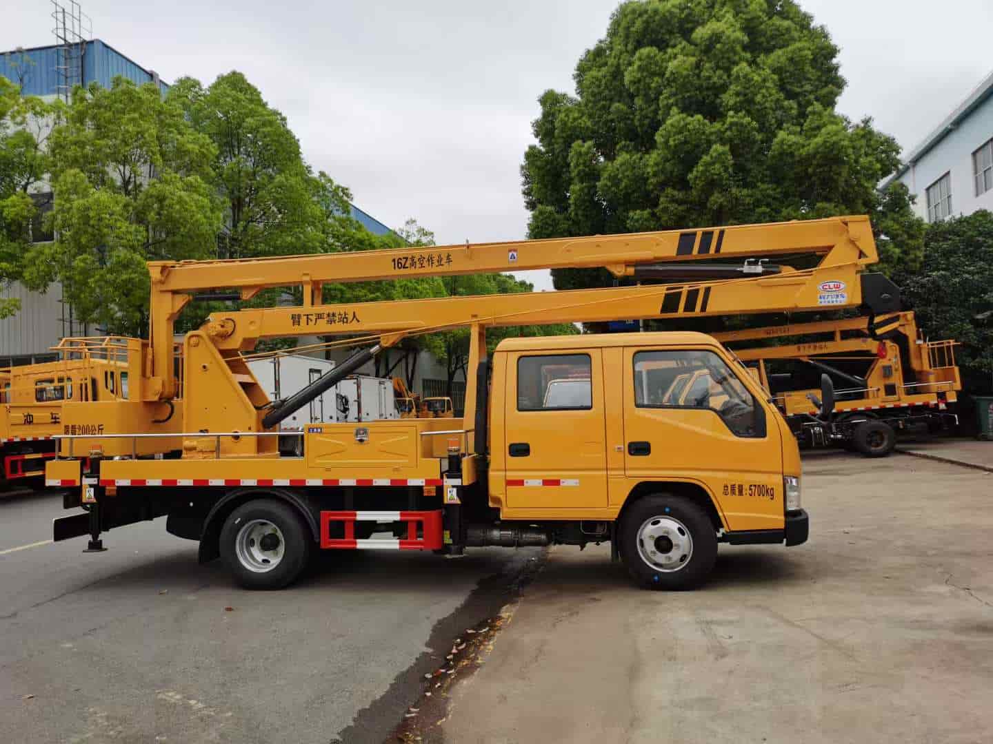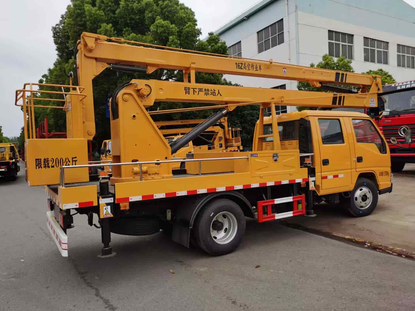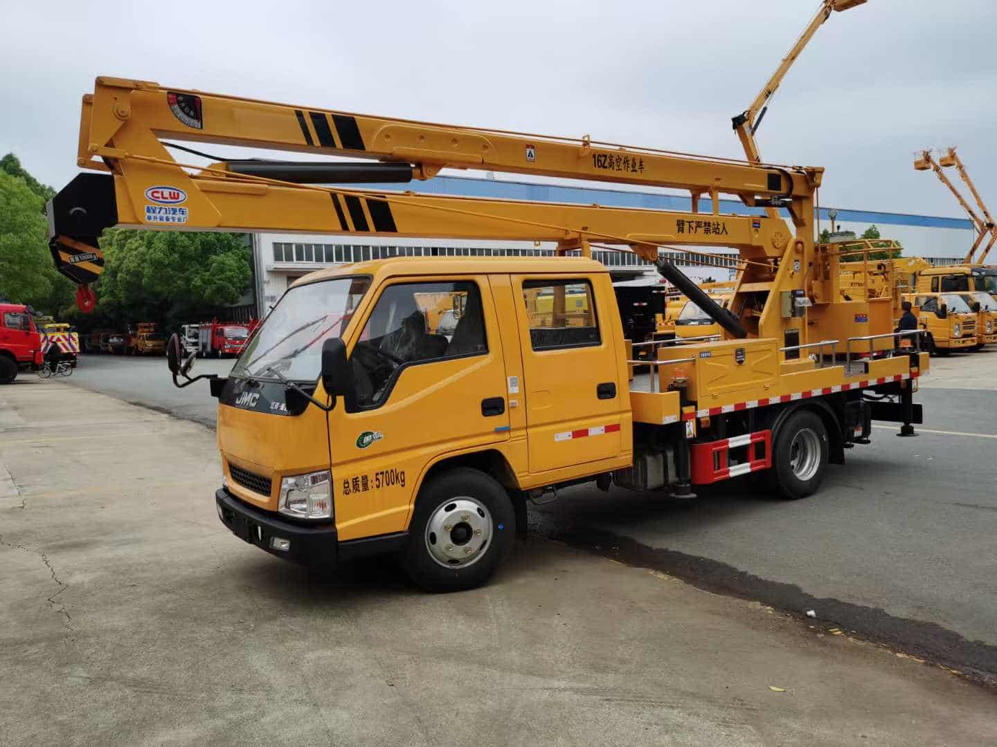 上装江铃16米/17.5米黄牌折臂高空作业车,液压 360 度全回转,三节折叠臂,单液压举升缸,带双向平衡阀,带电控操作举升臂, 四支液压油缸可调式支腿带双向液压锁(支腿操作为手动操作,可单独控制),上下二套操作台,带1吨吊钩,最大作业高度 16米/17.5米,最大起吊重量 1 吨。