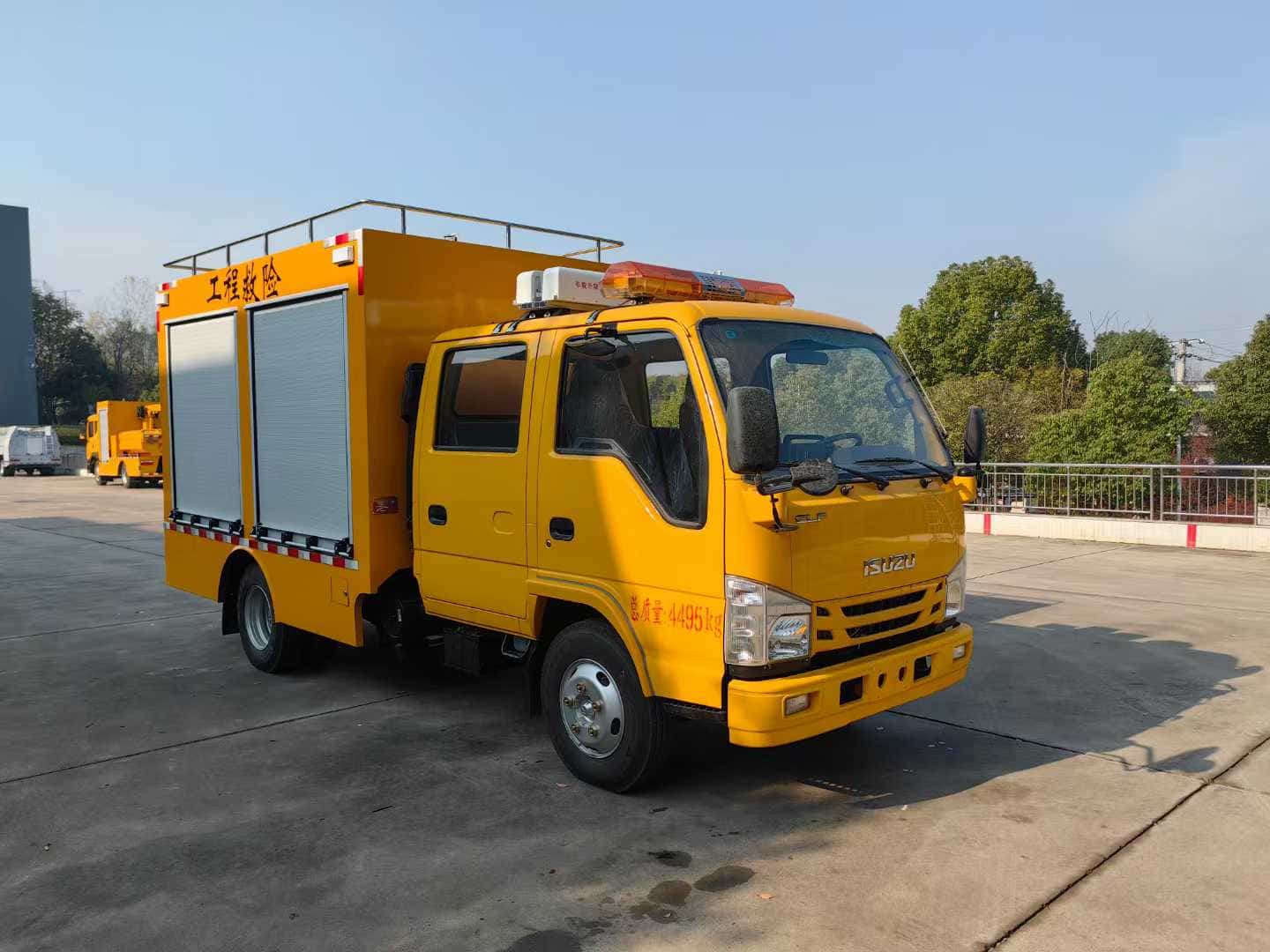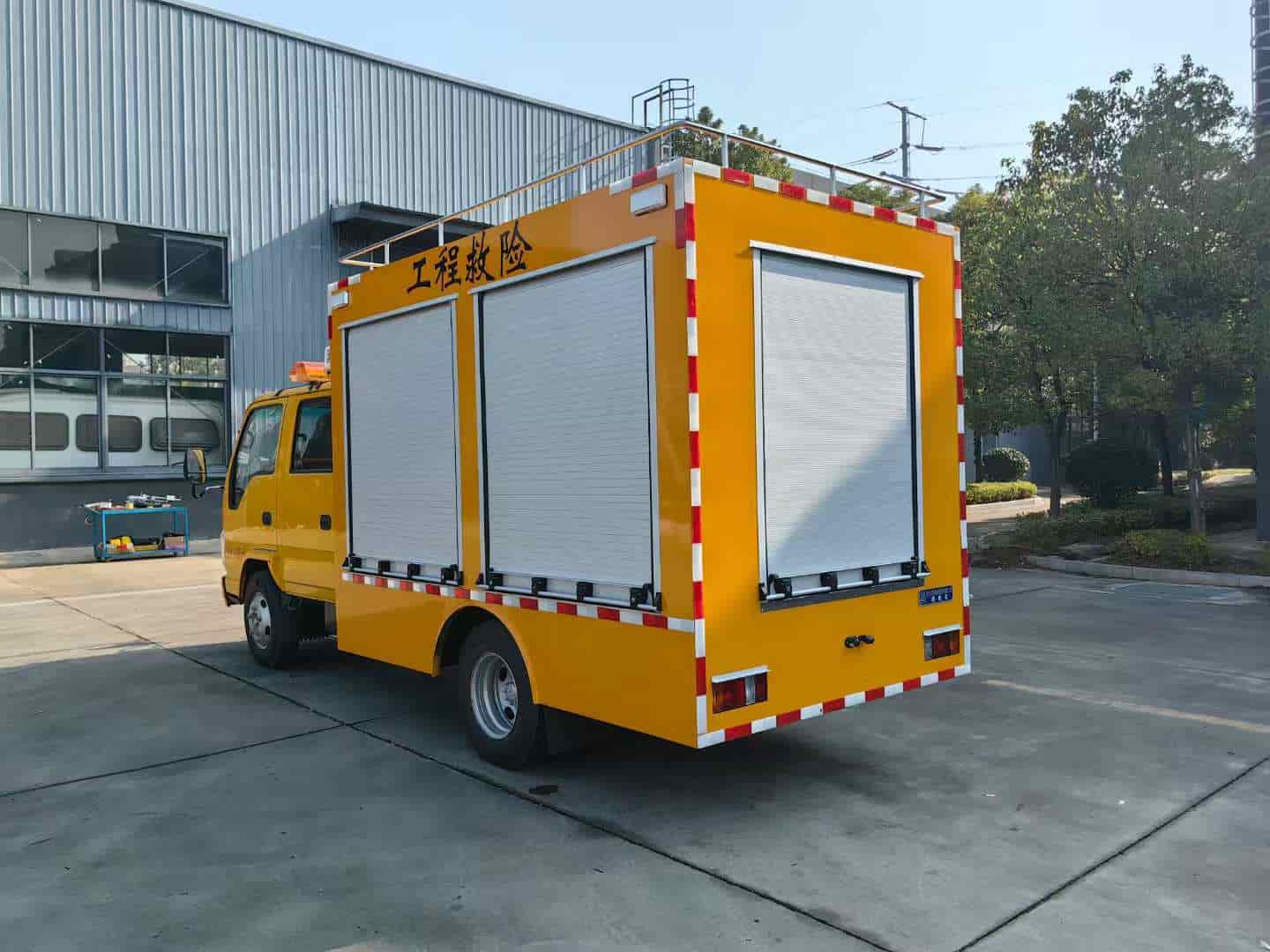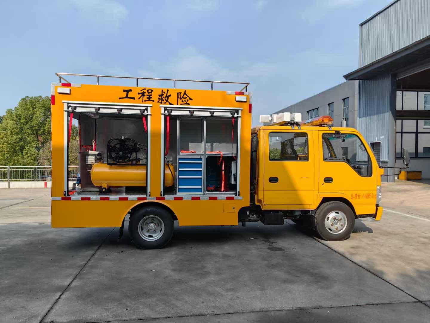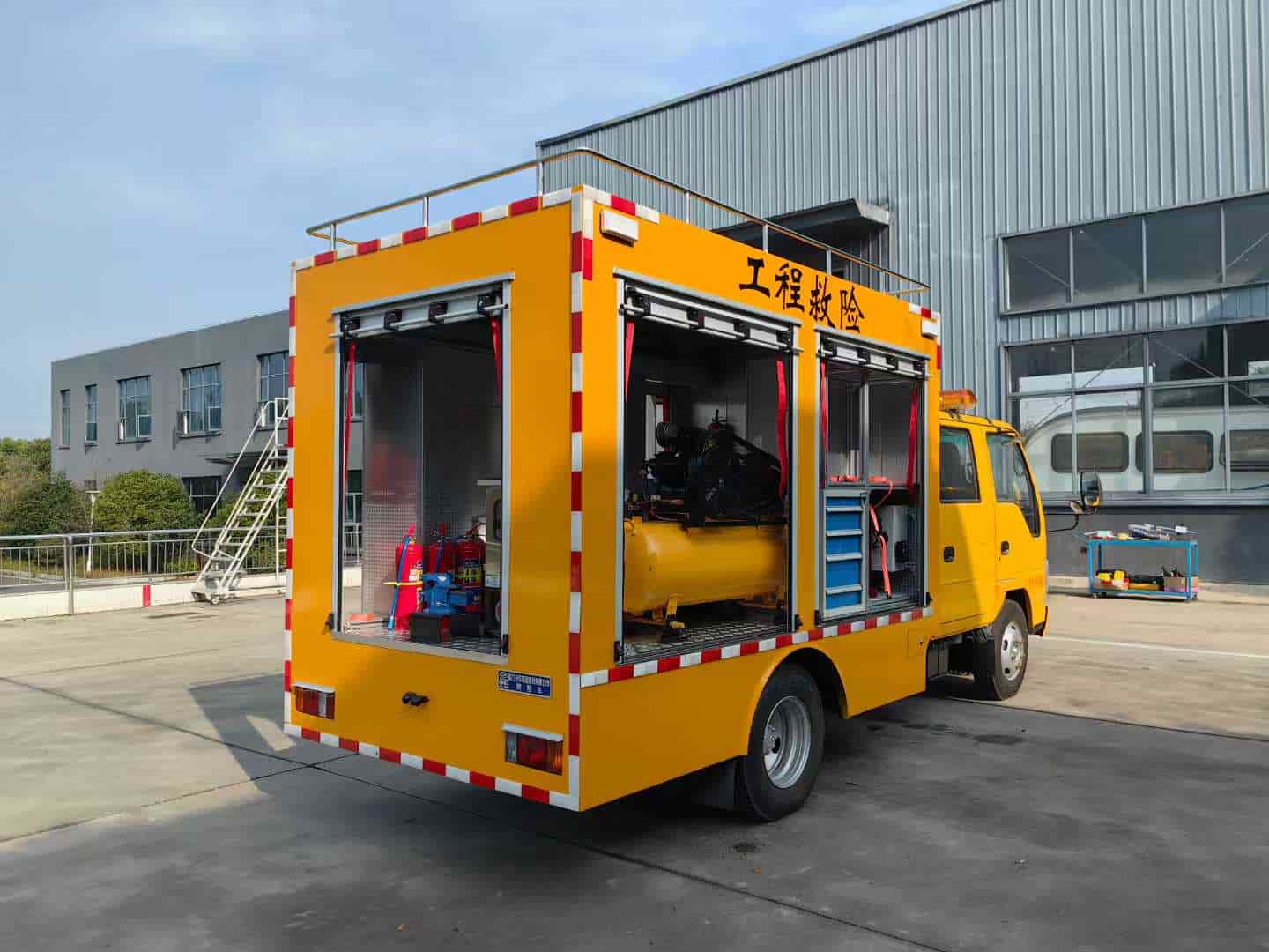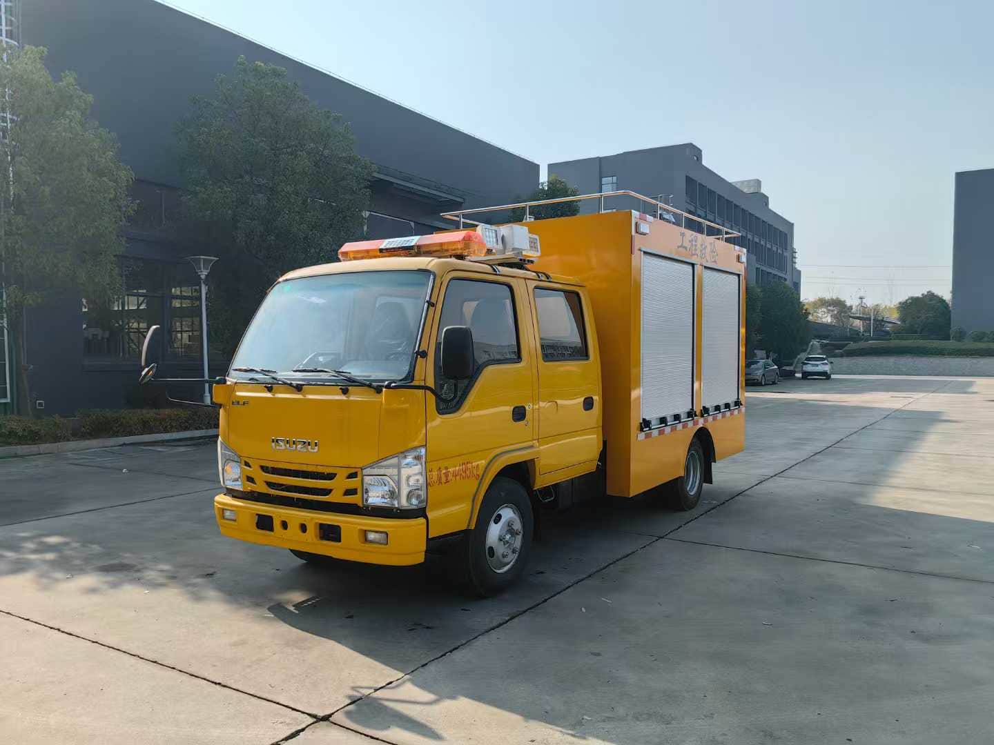 车厢表面采用汽车喷漆工艺,车厢地板表层应采用花纹防滑钢板,内部铝合金货架,承载力好材质轻便,车头安装长排工程警灯,带喊话器。车辆两侧各配2只共八只红蓝爆闪警灯,加装7寸可视倒车影像,灭火器4只*8kg,12kw发电机,发电机专用平拖,电源控制柜2个,顶部设计管子固定夹具,二氧化碳灭火器1只*7kg,尾部2侧分别放乙快氧气固定夹具,尾部专用工具夹具,圣帕空压机8kg3p,佳士氩弧焊机,工焊机,焊条保温桶,厢体感应灯,铝合金抽屉4个,卷盘线2*4平方100米,WQ 2200W排污泵,消防水带25米。锹、洋镐、遮阳伞。东城角磨机DCAFF03-100A,东城切割机J1G-FF02-3551.8KW,加装1.8米旋升降照明灯。