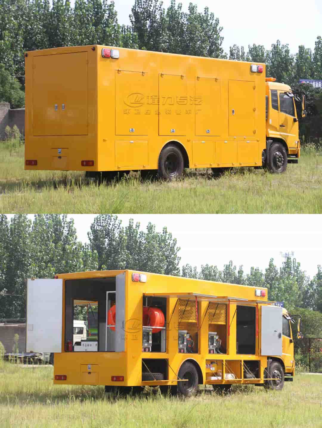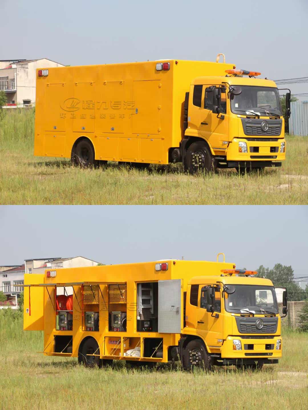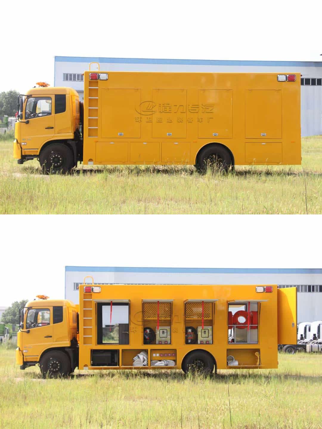 底盘配备康明斯230马力发动机,上装配备200/250/300千瓦发电机组,同时配8/10台便携式高速潜水泵,单台水泵流量可达500-1000m³/小时,扬程10米,每台泵配2根20米长 直径30厘米的排水管,排涝车一般多用于梅雨季节汛期防汛的紧急抢险排涝,效果非常显著,其优点排水量大、速度快,有效解决汛期难题。
