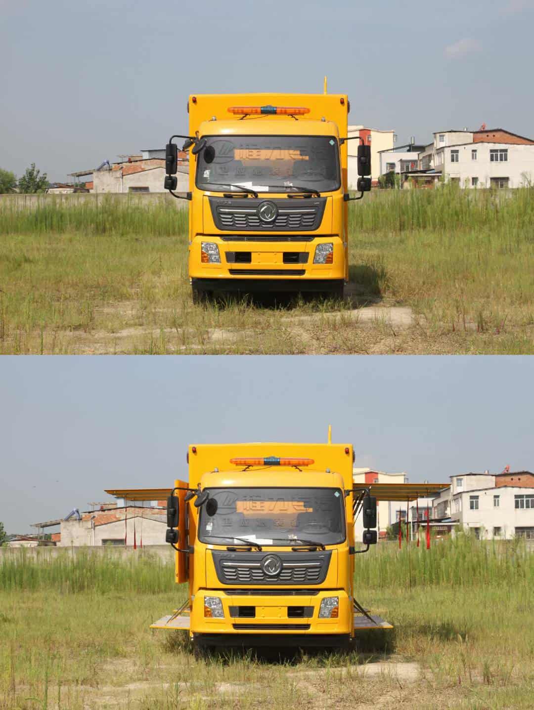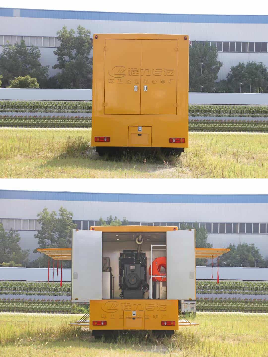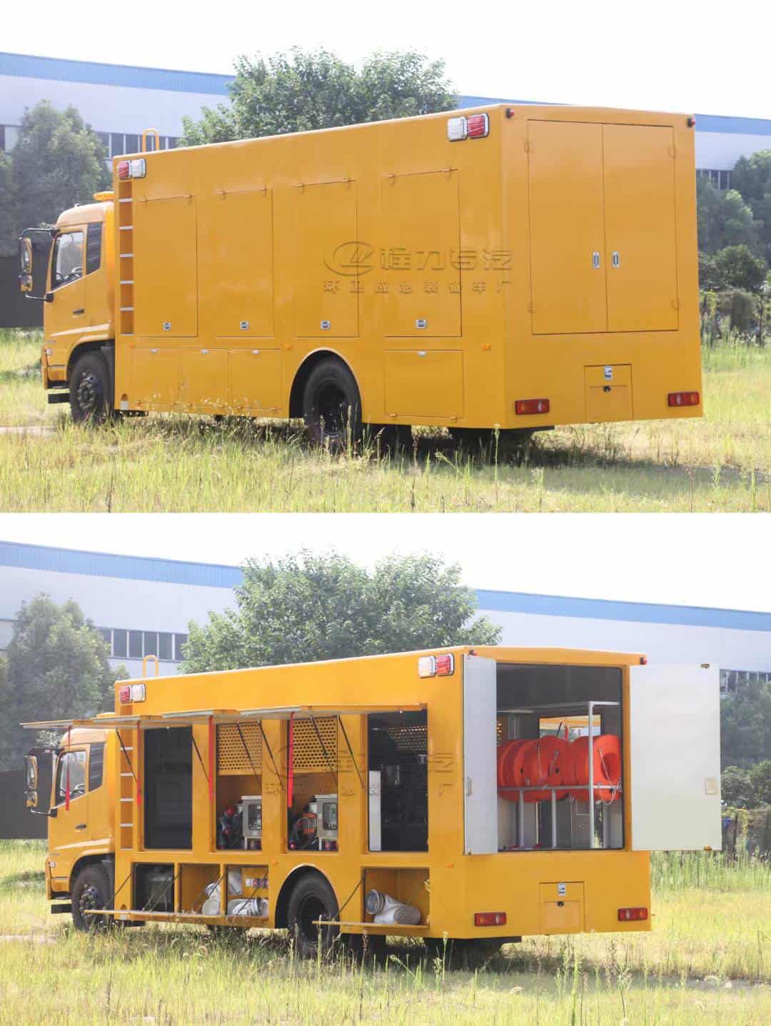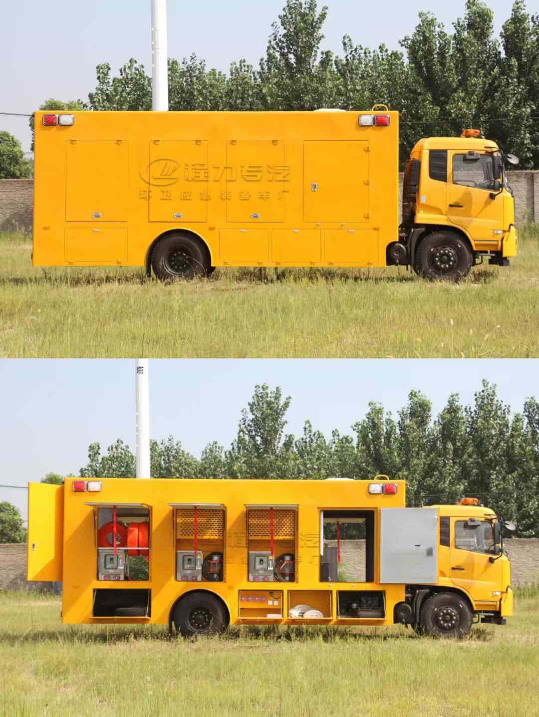 底盘配备康明斯230马力发动机,上装配备200/250/300千瓦发电机组,同时配8/10台便携式高速潜水泵,单台水泵流量可达500-1000m³/小时,扬程10米,每台泵配2根20米长 直径30厘米的排水管,排涝车一般多用于梅雨季节汛期防汛的紧急抢险排涝,效果非常显著,其优点排水量大、速度快,有效解决汛期难题。