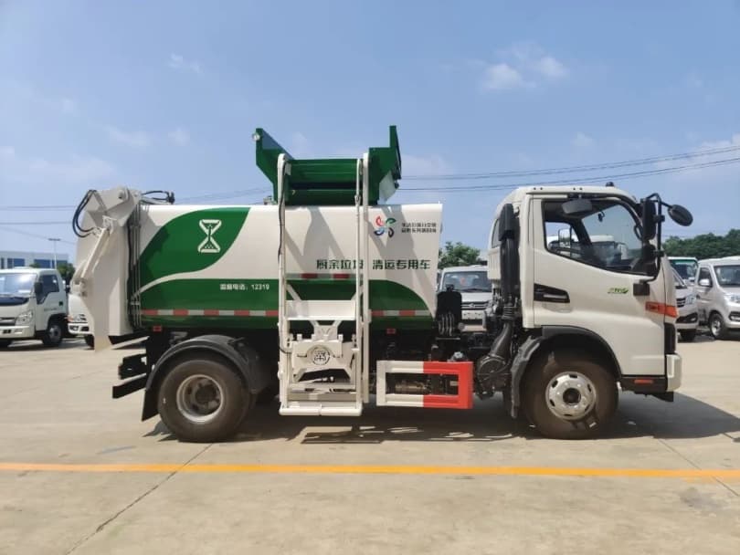 2.配置国标垃圾桶上料装置,挂桶提升机采用连杆结构,适配 120L 和 240L 垃 圾桶,上料举升平稳不抛洒。针对较重的餐厨垃圾做了特别优化:垃圾桶托架增加滚轮,用滚动摩擦代替滑动摩擦,减小垃圾桶满载状态下提升时摩擦对垃圾桶 的损伤。