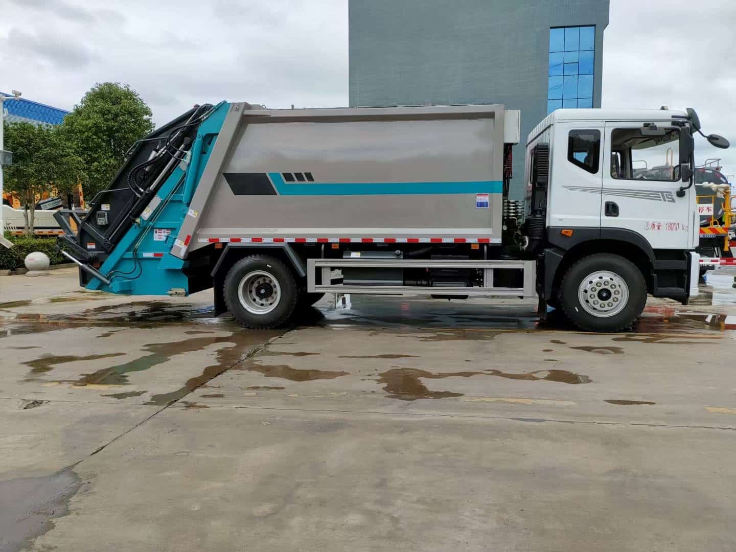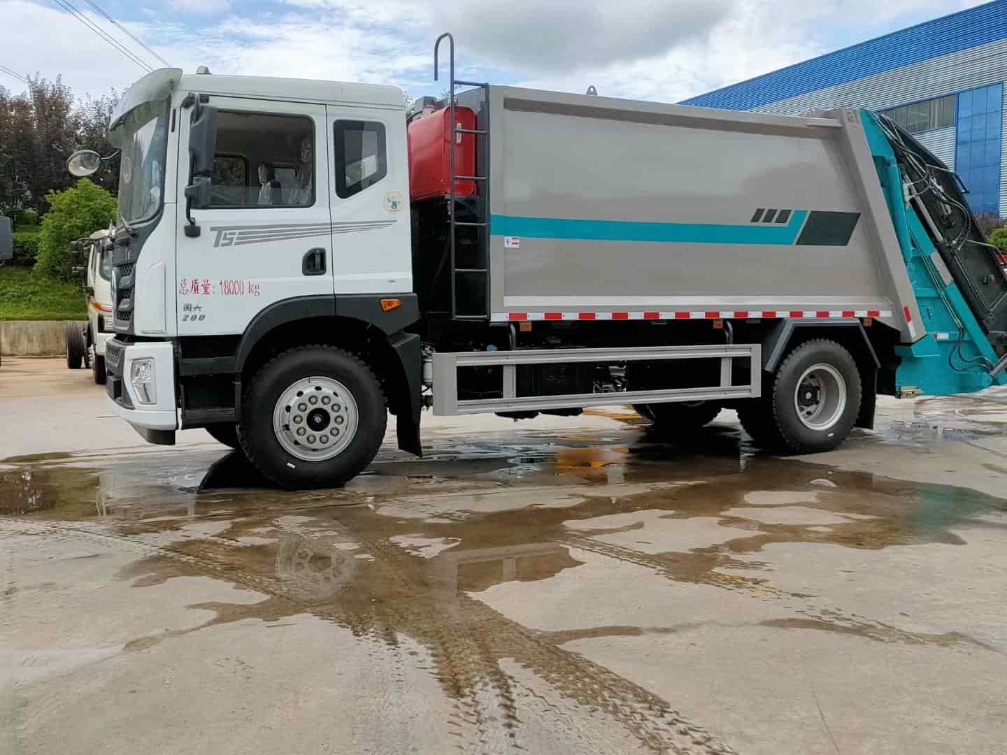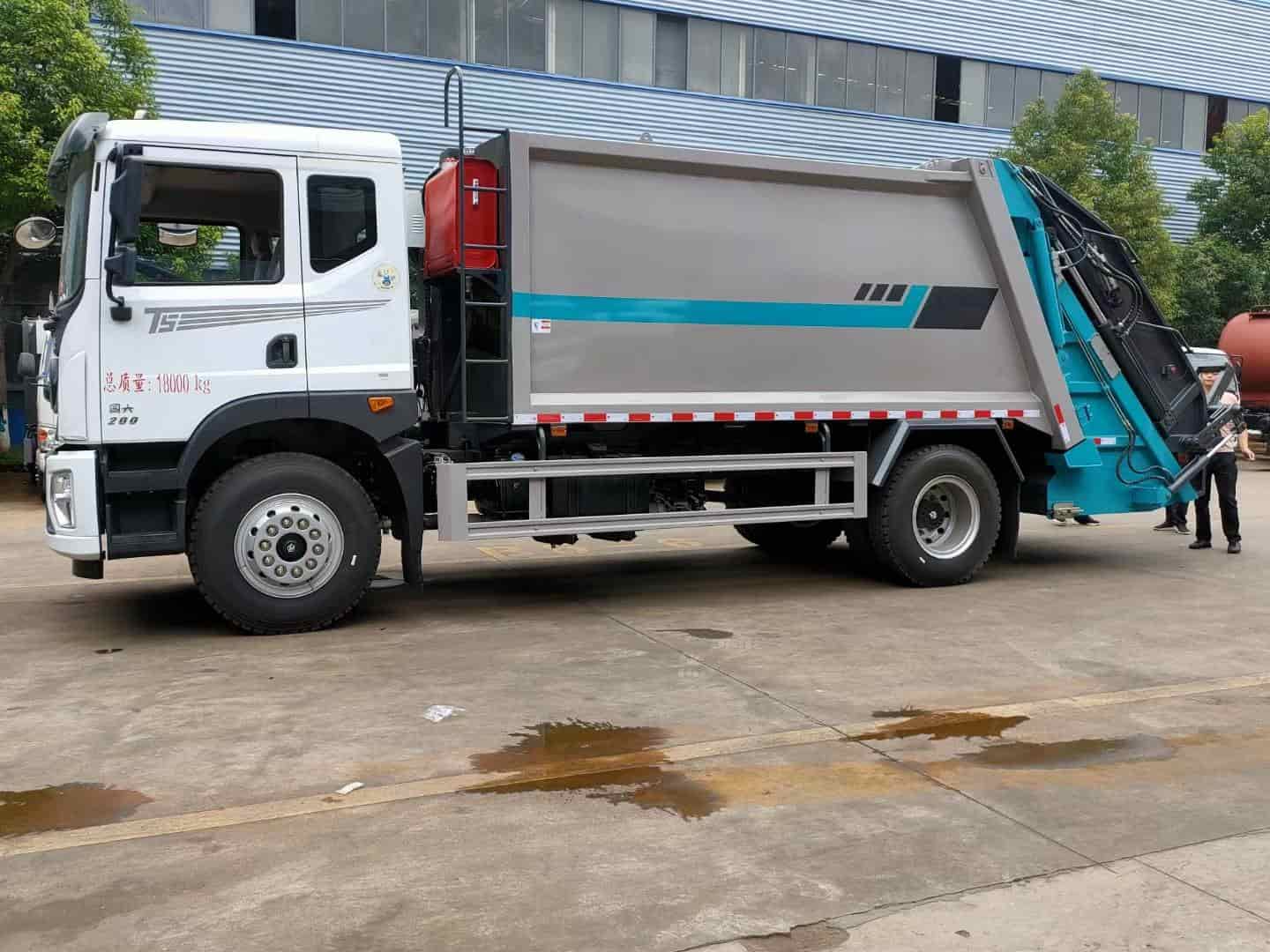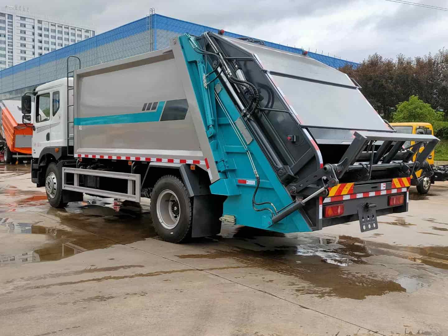 箱体容积14立方,采用边四底五高强板制作,尾部挂桶翻转机构带气动密封盖。