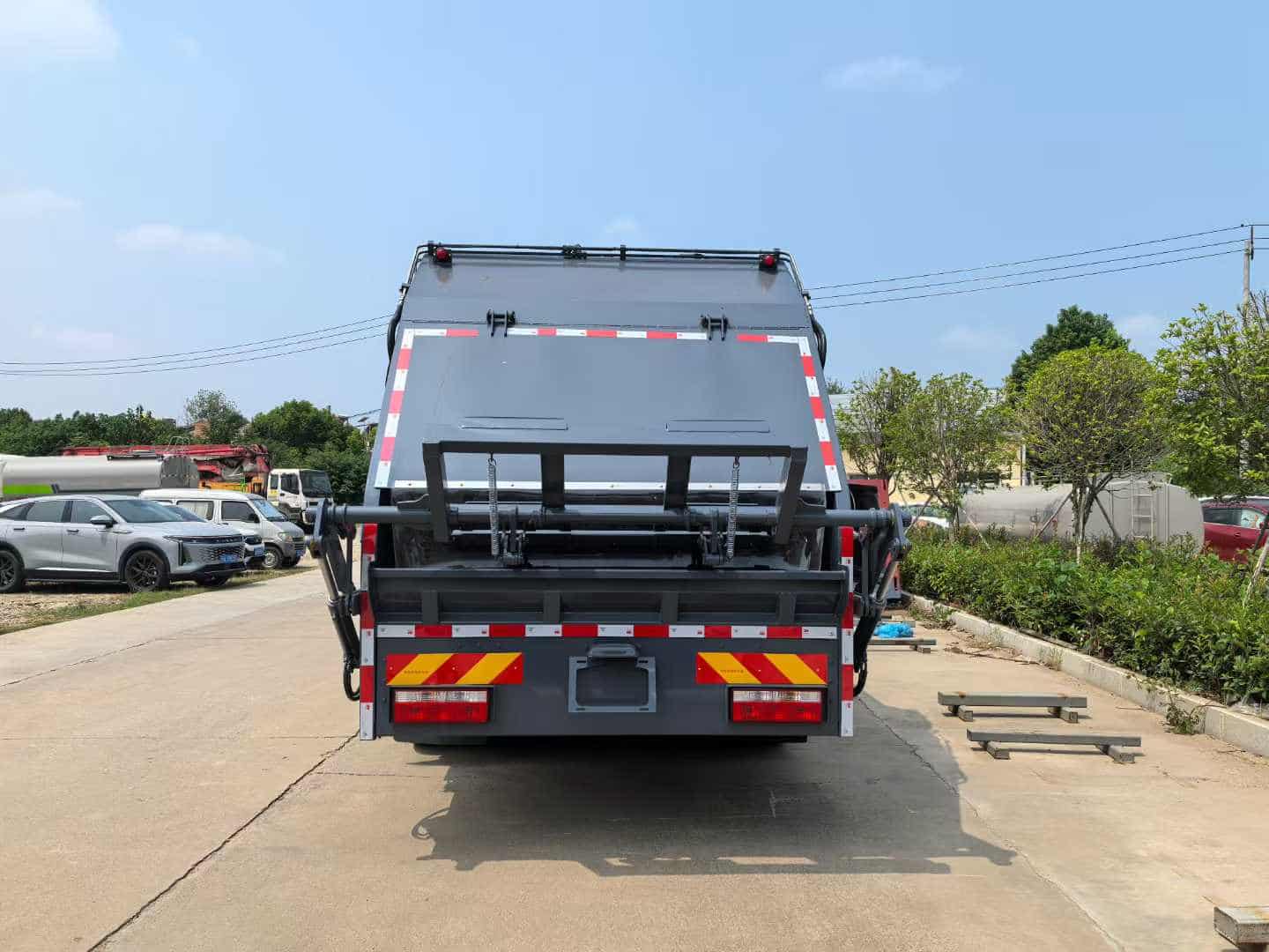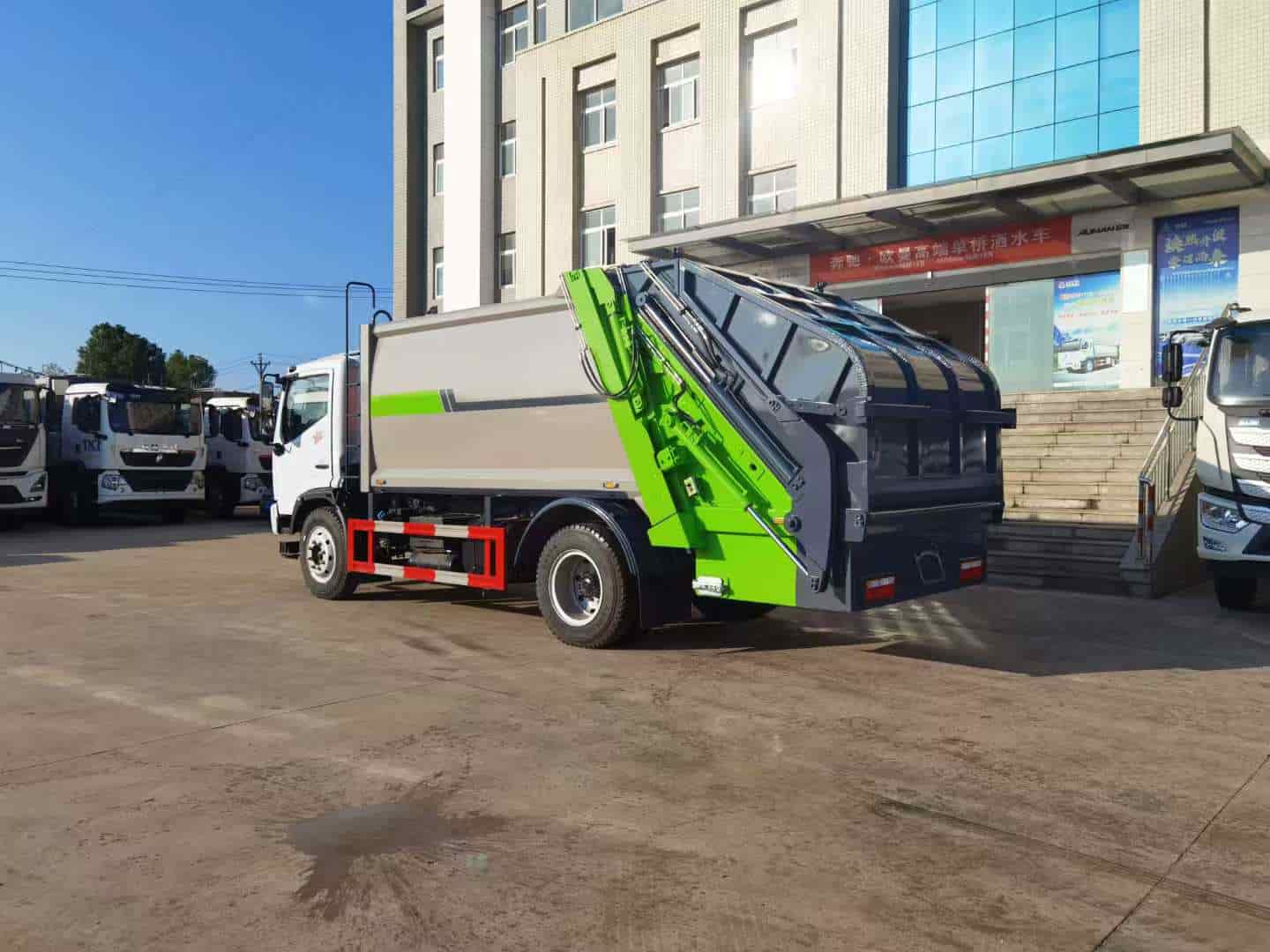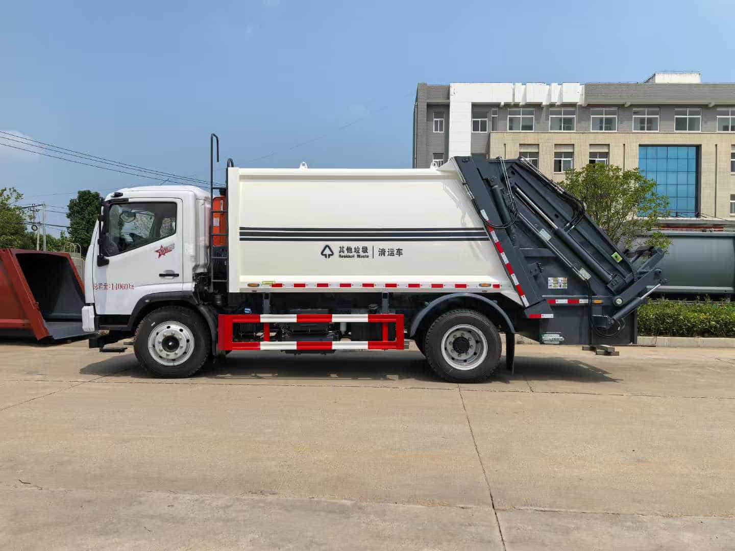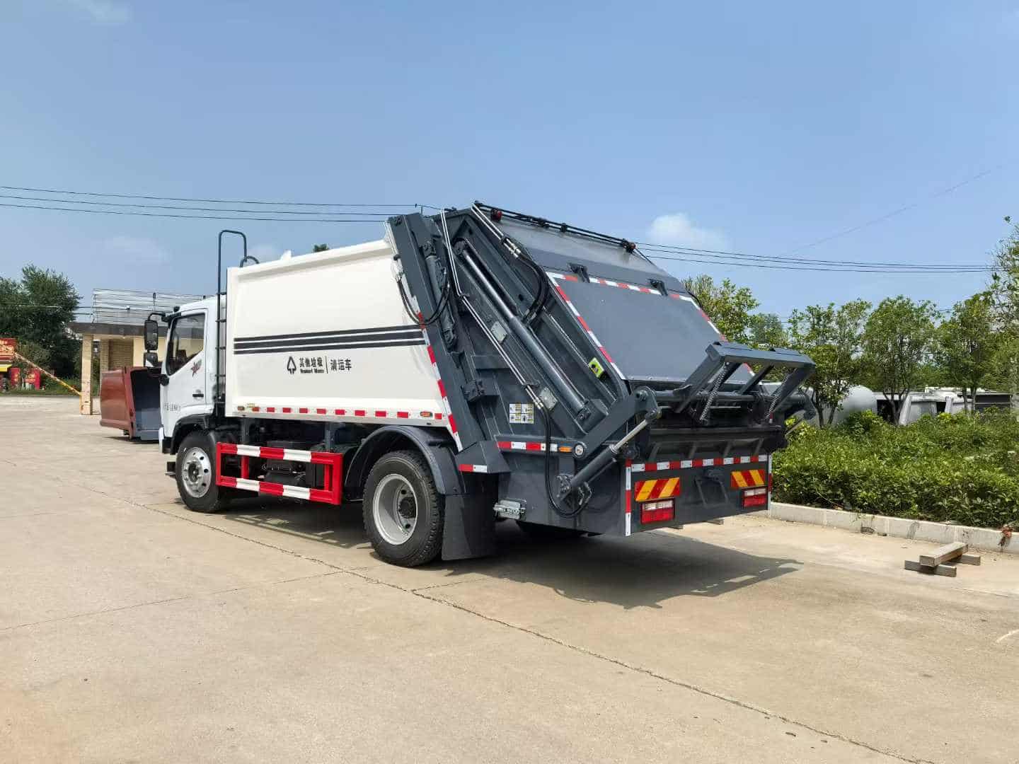上装配置:弧形箱体,容积12立方,箱体采用Q345锰板,边3mm底4mm顶4mm,填充器采用Q710高强钢,弧形底板5mm,滑轨8mm,福建山友油缸,中梅多路阀,皖液油泵(可选装双联泵),填装器举升油缸带双向平衡阀,采用湖南长沙CAN总线电控系统,德国伊顿操作面板,日本川户无线遥控器(采用光电开关,带一键操作、手动操作和无线遥控三种控制方式),操作盒共两只(驾驶室内部及后尾部右侧可操作,填充器左侧安装一个急停开关),后填装器标准下部一只污水箱,底盘大梁一侧一只污水箱(可选装),尾部标配可同时挂两个240L国标垃圾桶,其余按公司标准配置制作。