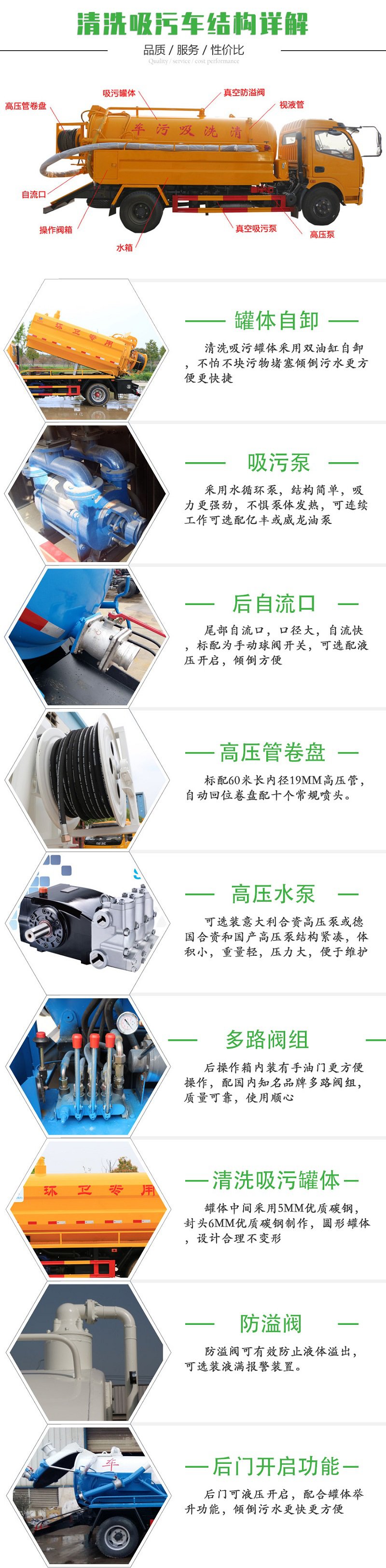 清洗部分:5方水箱,采用8mmQ235优质碳钢板,水箱两侧消防接口进水,工具箱一个。采用天津通洁250L流量高压泵,配100米内径19#高压管,10个大小不同喷头一套, 后置式清洗卷盘,带淋管装置(用于淋洗高压管疏通管道过后上面残留的污物),带气吹水功能(用于吹出每次高压管工作完以后内部残留的水渍,防止天冷结冰影响下次使用)