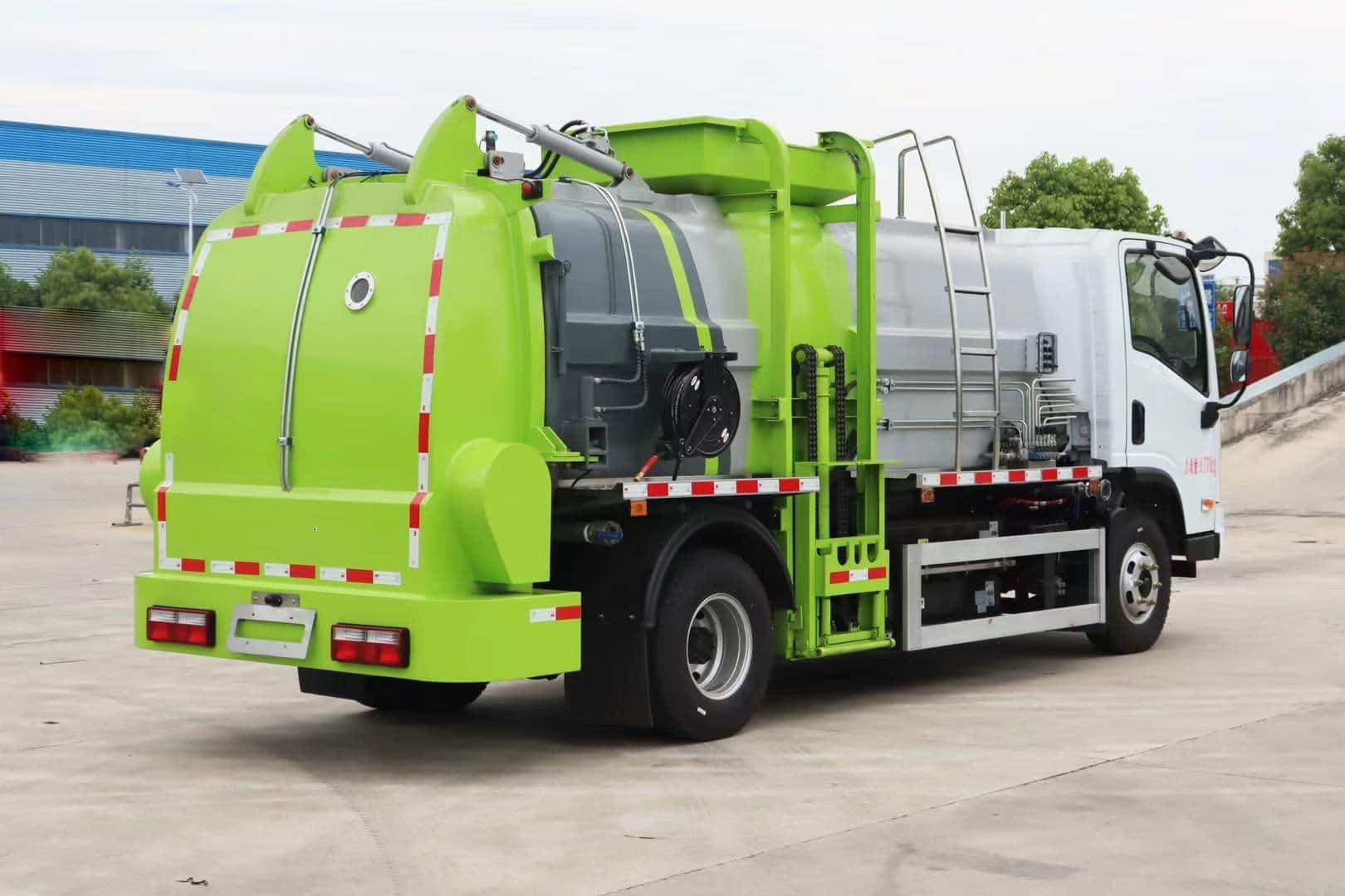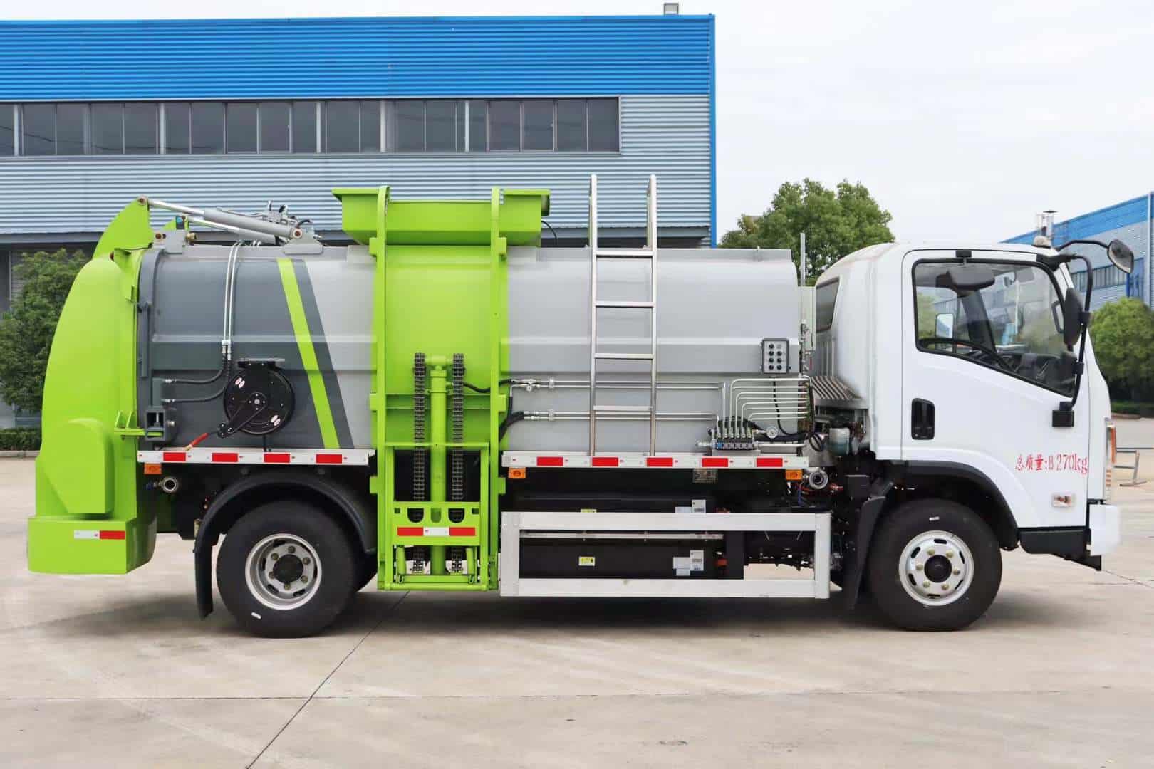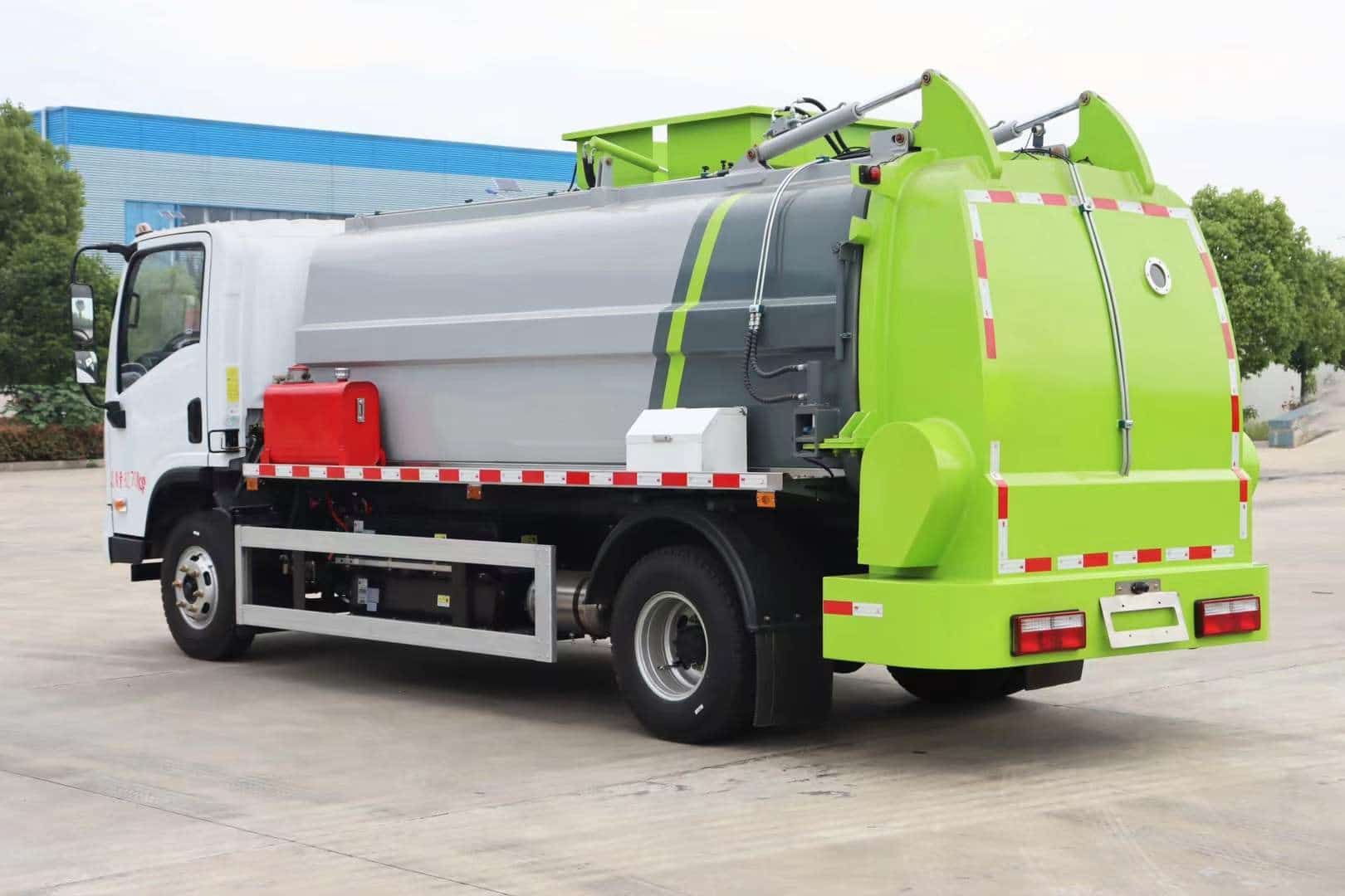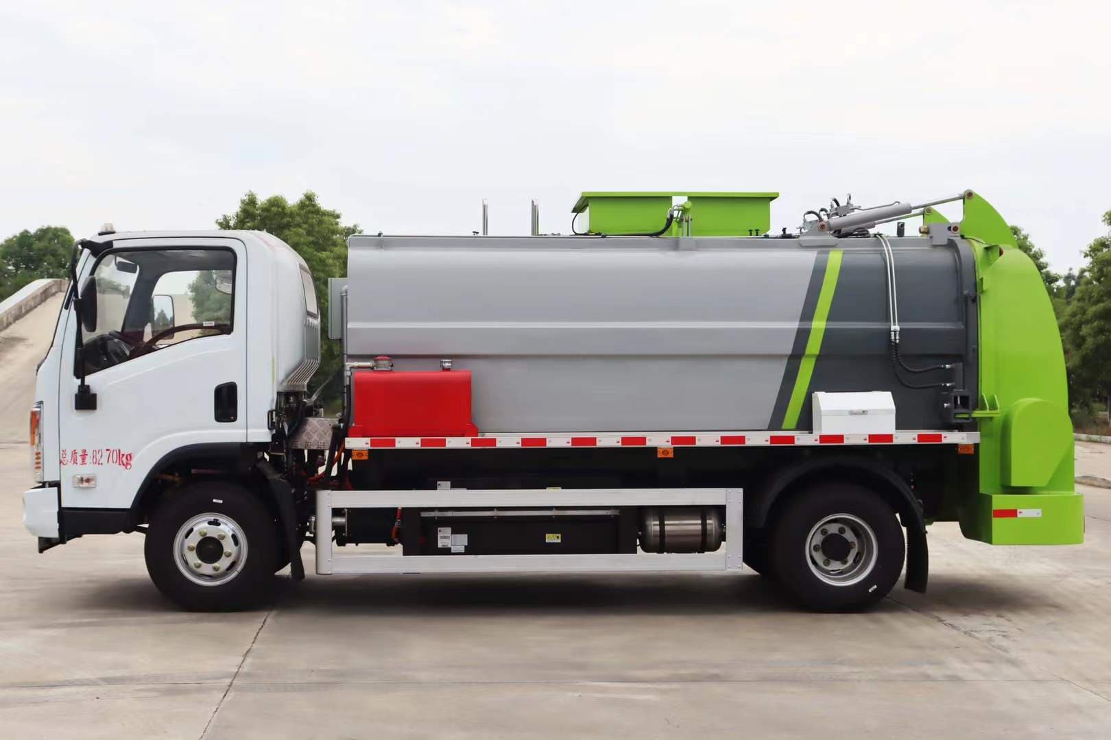 后盖配防腐硅胶密封条。4.后门液压锁紧5.链条式提升机,可挂120/240升标准塑料垃圾桶。进料口盖液压开关。6.驾驶室内电控(提升机外部手动控制),