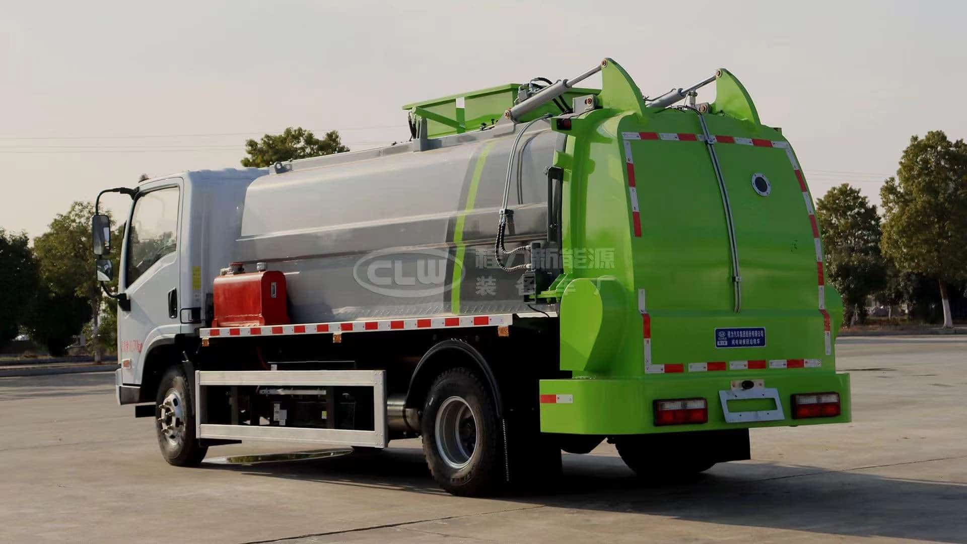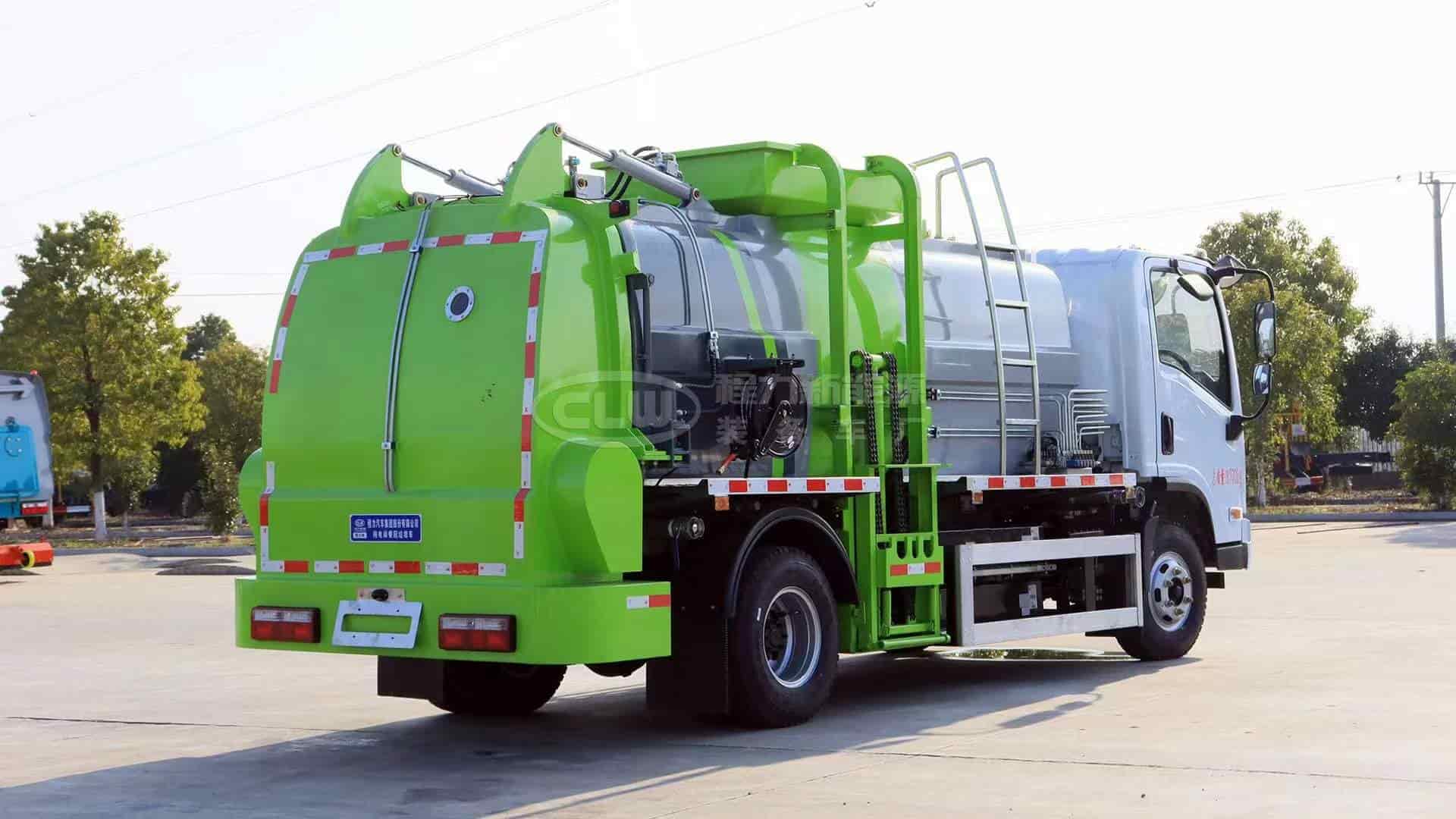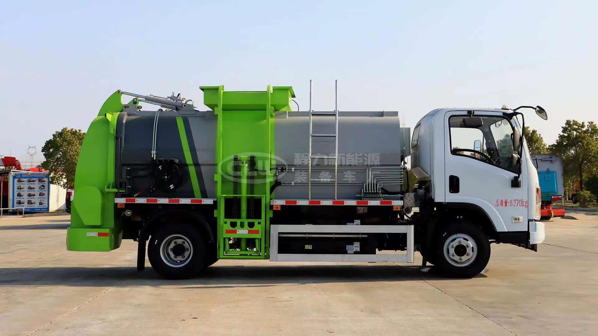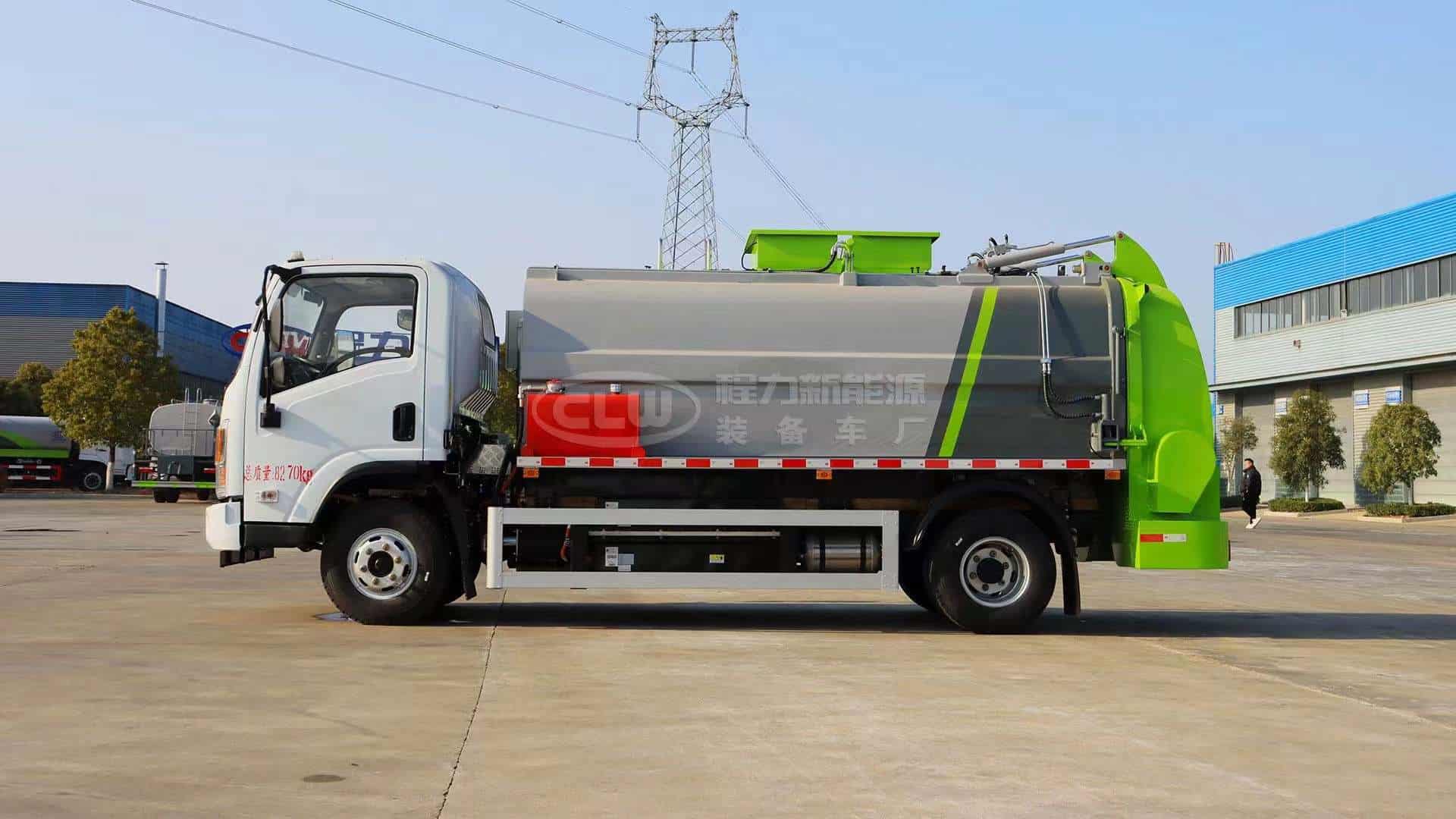 底盘电池提供动力,永磁同步电机驱动,可根据需要实时调速,取力操作与底盘行驶系统无任何关联,用车体验感极佳。优质高强度 Q345 锰钢制作无泄漏箱体,标配:1.弧形罐体,边四底五/边五底六。2.长源/皖液油泵,长源/中梅多路阀,知名液压油缸。3.全推铲卸料(不带举升功能),具有干湿分离功能。液压后盖,后盖配防腐硅胶密封条。4.后门液压锁紧5.链条式提升机,可挂120/240升标准塑料垃圾桶。进料口盖液压开关。6.驾驶室内电控(提升机外部手动控制),后门锁紧与后盖开关的操作具有防误操作。7.箱体带清洗装置(液压马达带动高压泵、带水箱)。