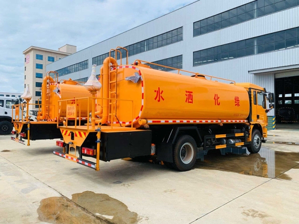 上装:严格按照公告尺寸及外观制作。罐体采用优质碳钢,配备大功率洒水泵,可自吸自排。专用功能为:前冲后洒,带侧喷,罐体后带工作平台,平台上安装绿化洒水高炮,